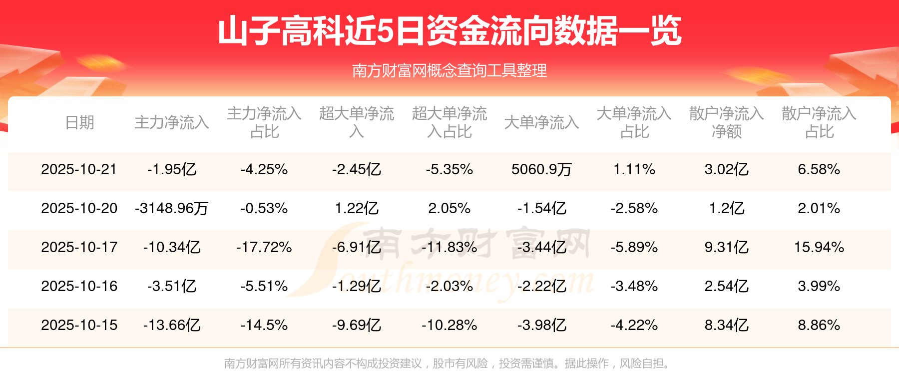 10月21日消息,山子高科主力净流出1.95亿元,超大单净流出2.45亿元,散户净流入3.02亿元。