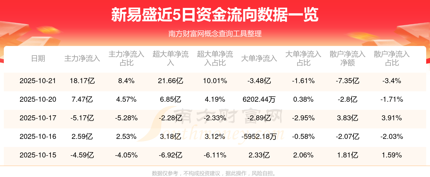 10月21日消息,新易盛主力净流入18.17亿元,超大单净流入21.66亿元,散户净流出7.35亿元。