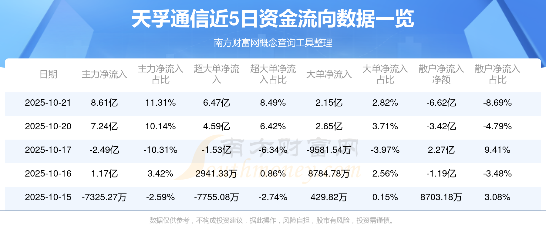 10月21日消息,天孚通信资金净流入8.61亿元,超大单资金净流入6.47亿元,换手率5.98%,成交金额76.17亿元。