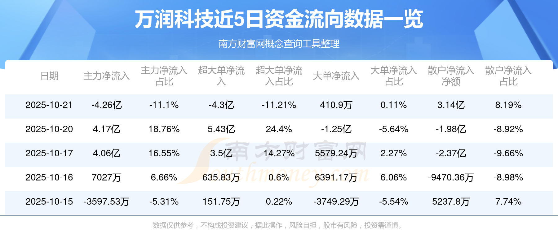 10月21日消息,万润科技主力净流出4.26亿元,超大单净流出4.3亿元,散户净流入3.14亿元。