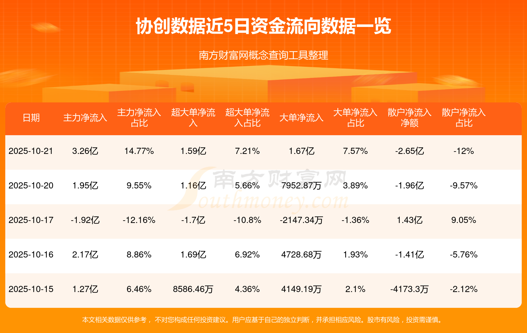 10月21日消息,协创数据主力净流入3.26亿元,超大单净流入1.59亿元,散户净流出2.65亿元。