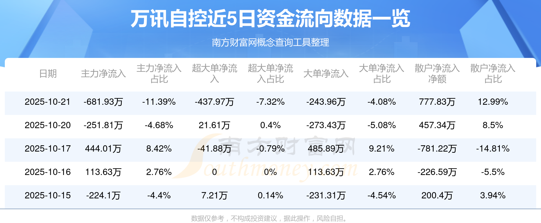10月21日消息,万讯自控10月21日主力资金净流出681.93万元,超大单资金净流出437.97万元,大单资金净流出243.96万元,散户资金净流入777.83万元。