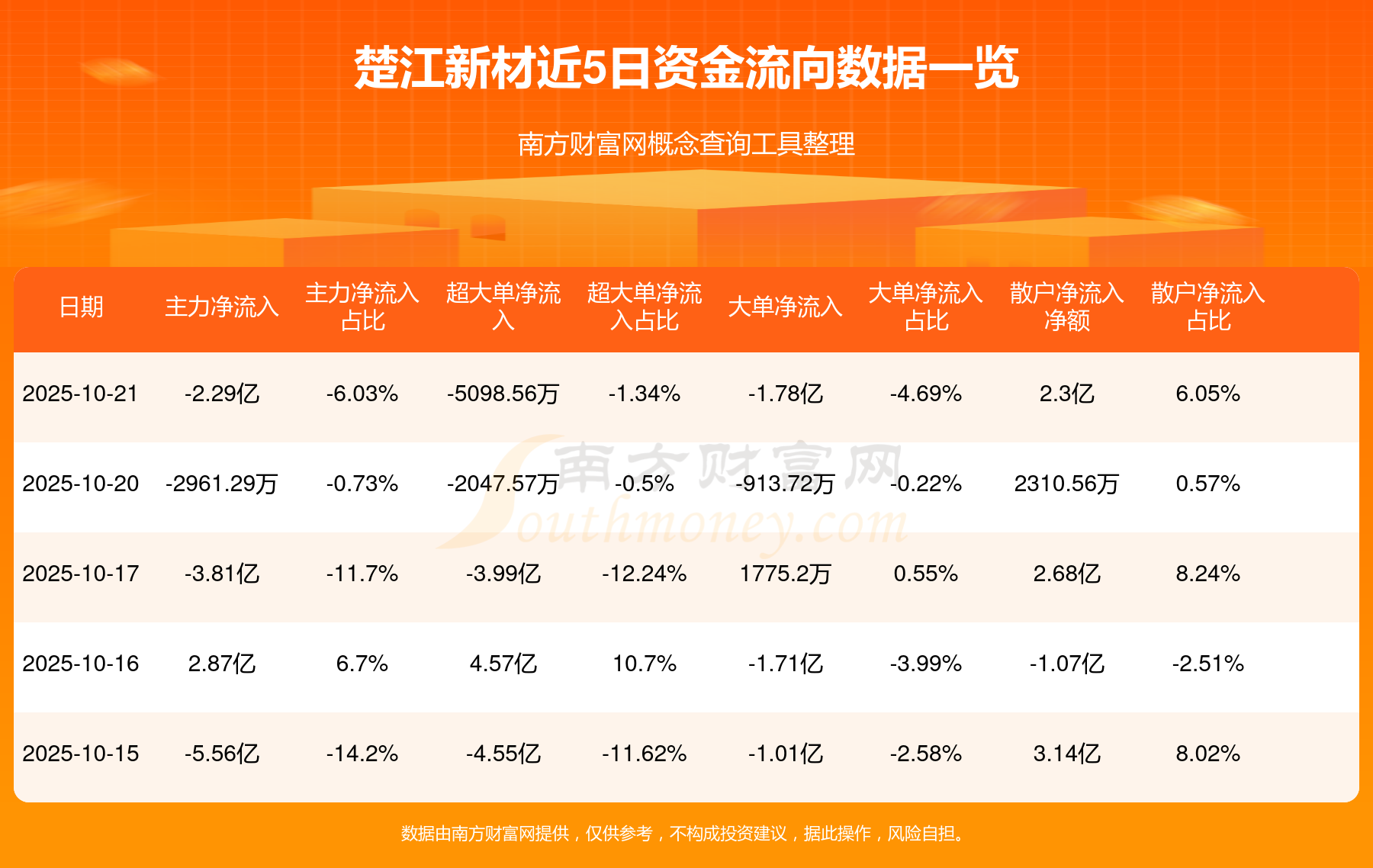 10月21日消息,楚江新材主力净流出2.29亿元,超大单净流出5098.56万元,散户净流入2.3亿元。