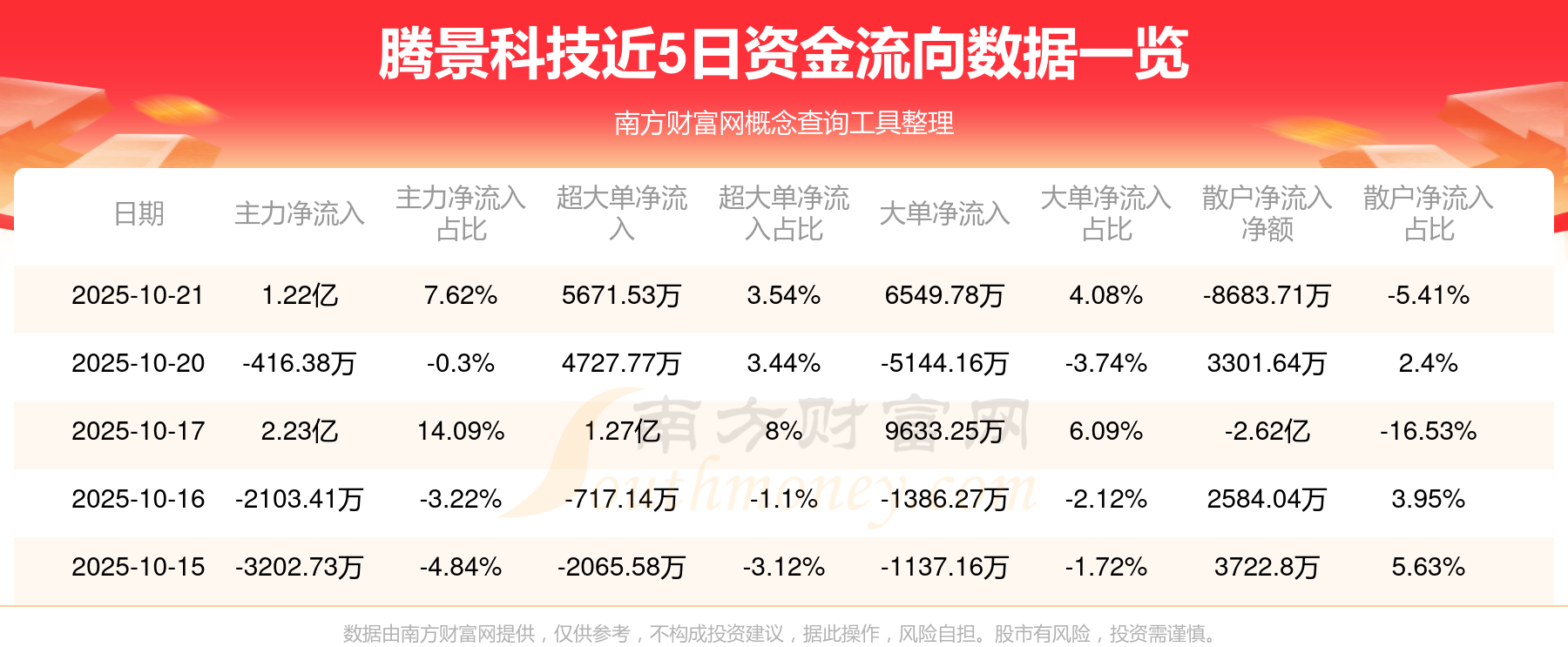 10月21日消息,腾景科技10月21日主力资金净流入1.22亿元,超大单资金净流入5671.53万元,大单资金净流入6549.78万元,散户资金净流出8683.71万元。