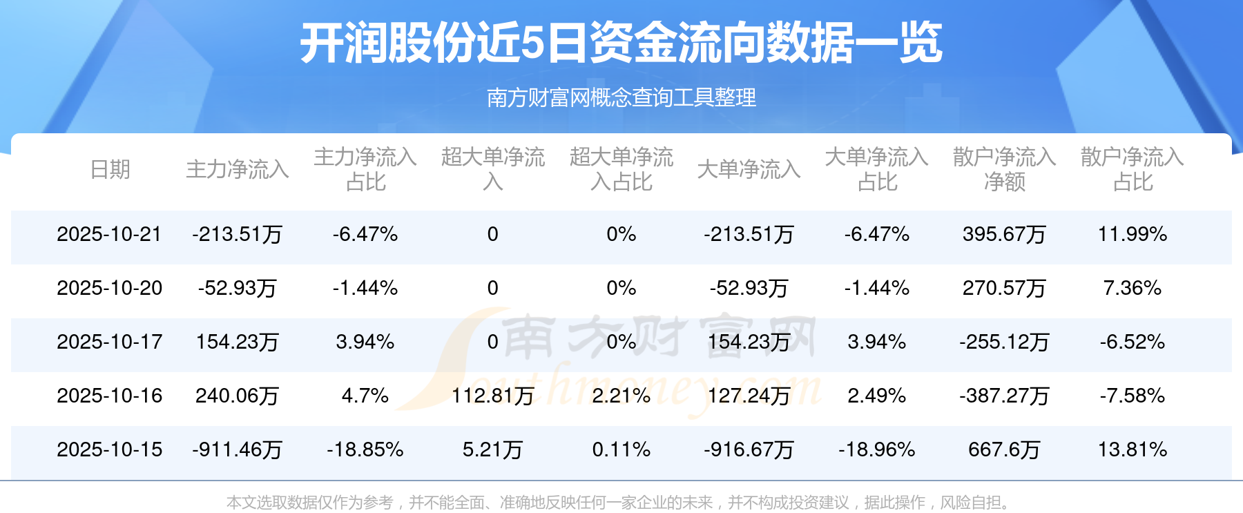 10月21日消息,开润股份资金净流出213.51万元,换手率0.36%,成交金额1193.03万元。