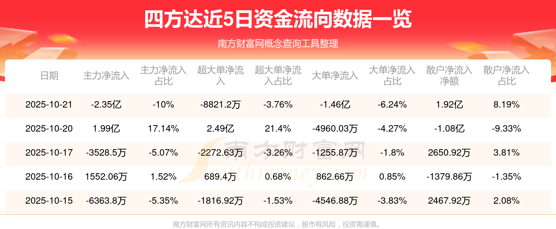 10月21日消息,四方达10月21日主力净流出2.35亿元,超大单净流出8821.2万元,大单净流出1.46亿元,散户净流入1.92亿元。