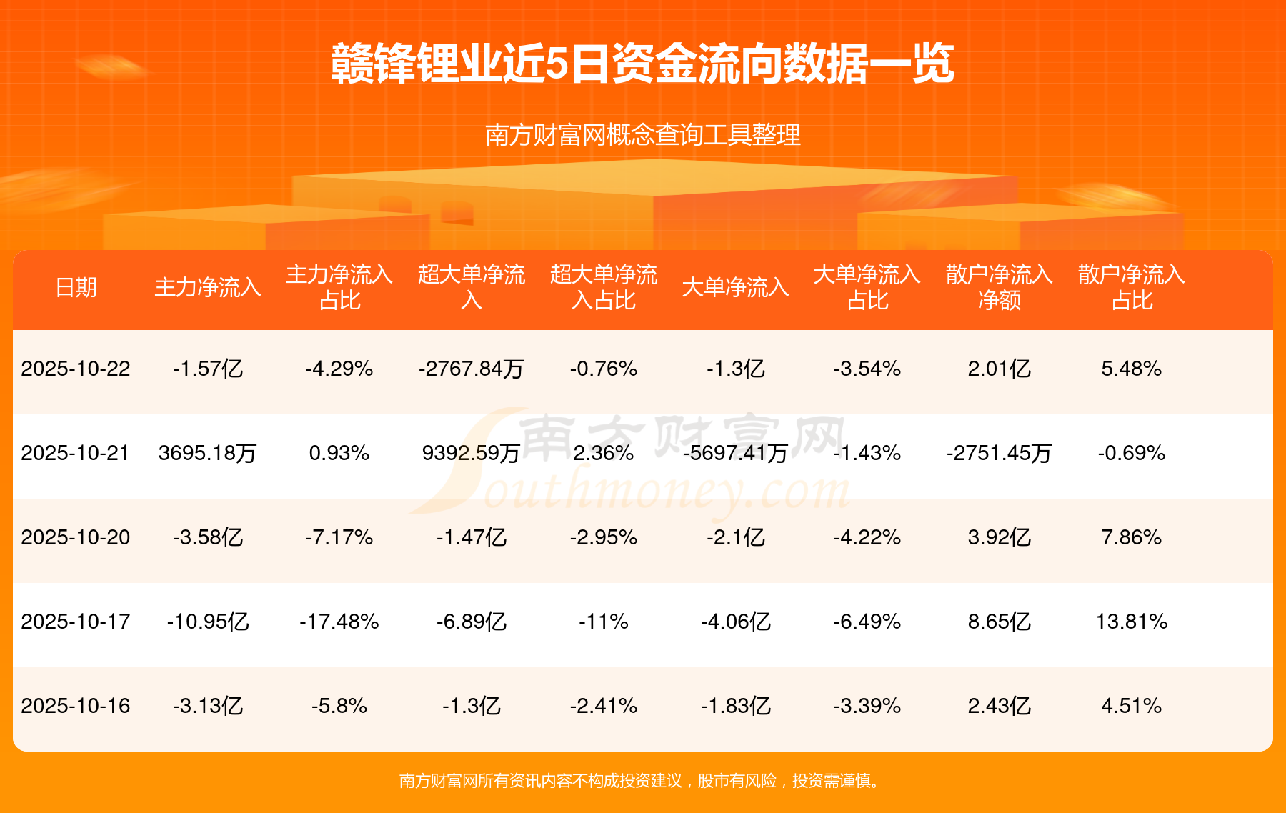 10月22日消息,赣锋锂业资金净流出1.57亿元,超大单资金净流出2767.84万元,换手率5.01%,成交金额36.62亿元。