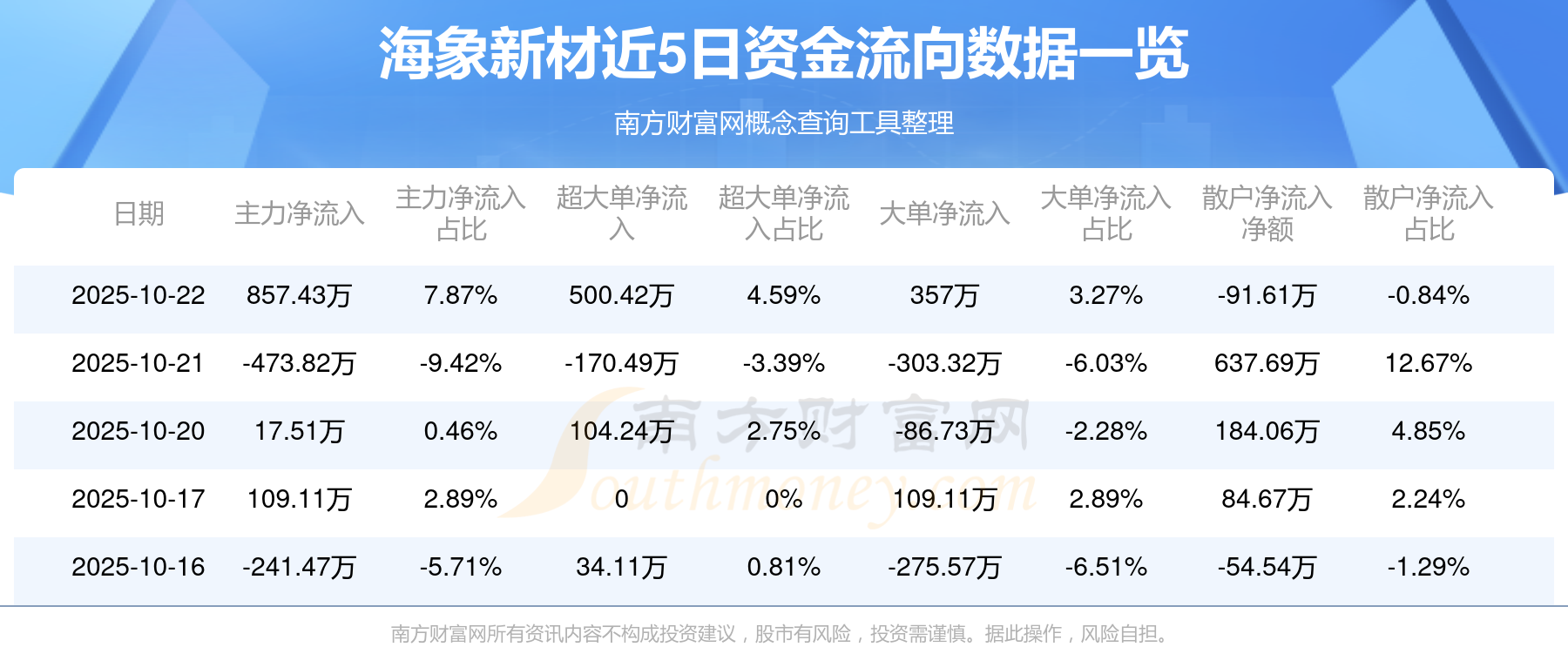 10月22日该股主力净流入857.43万元,超大单净流入500.42万元,大单净流入357万元,中单净流出765.81万元,散户净流出91.61万元。