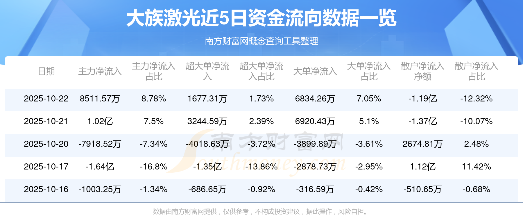 10月22日消息,大族激光资金净流入8511.57万元,超大单资金净流入1677.31万元,换手率2.76%,成交金额9.69亿元。