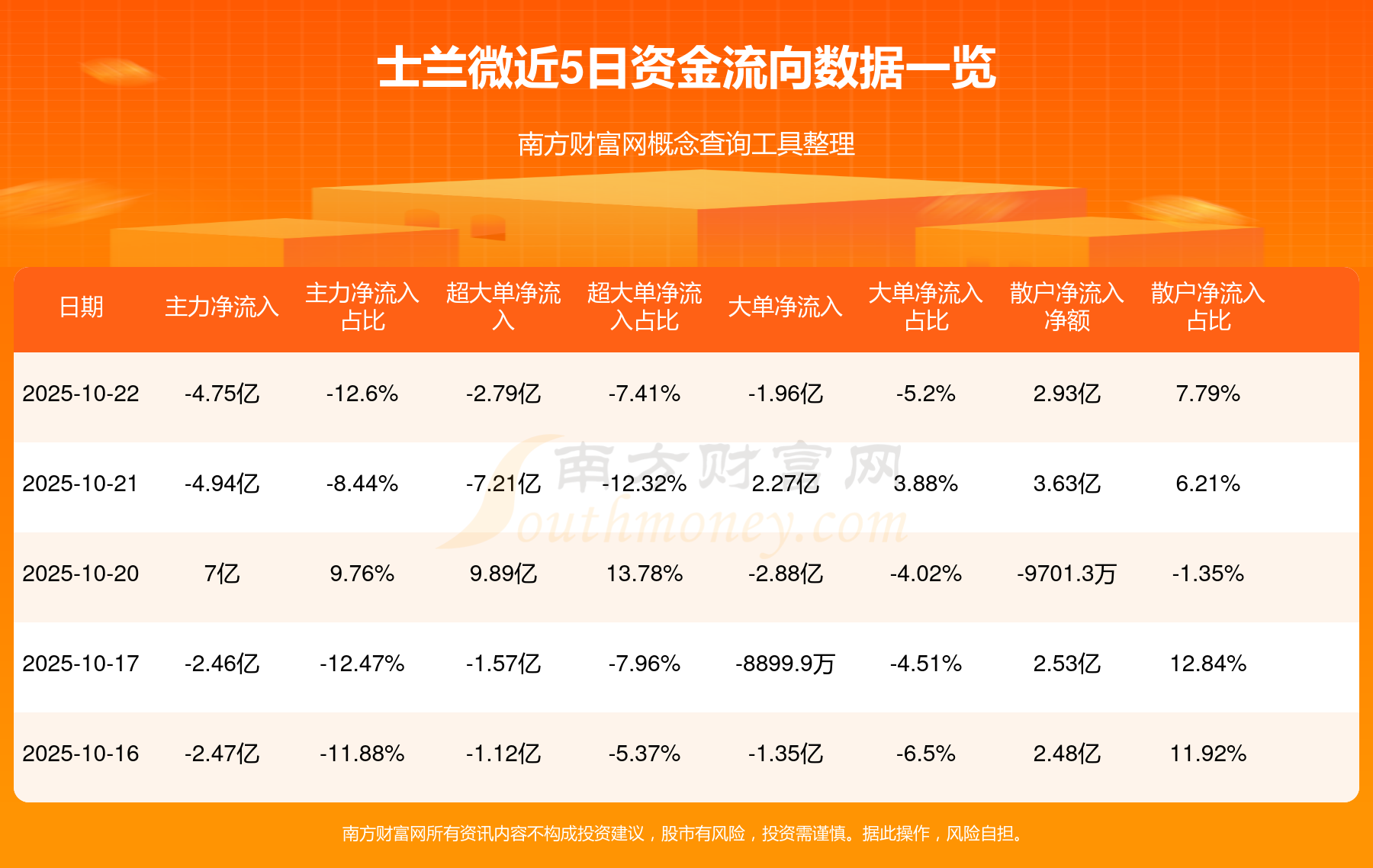 10月22日消息,士兰微10月22日主力净流出4.75亿元,超大单净流出2.79亿元,大单净流出1.96亿元,散户净流入2.93亿元。