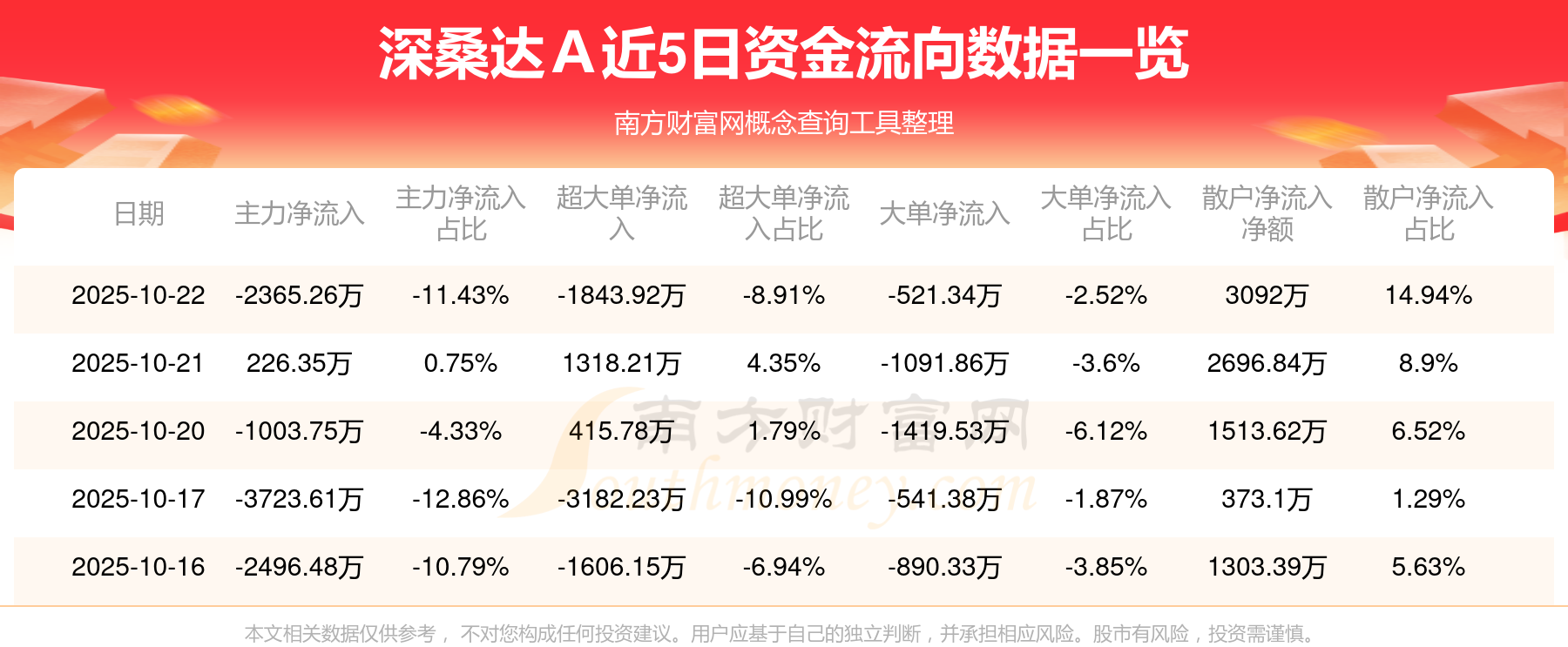 10月22日消息,深桑达A主力净流出2365.26万元,超大单净流出1843.92万元,散户净流入3092万元。