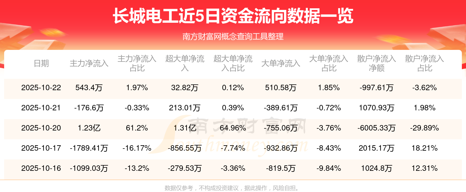 10月22日消息,长城电工10月22日主力净流入543.4万元,超大单净流入32.82万元,大单净流入510.58万元,散户净流出997.61万元。