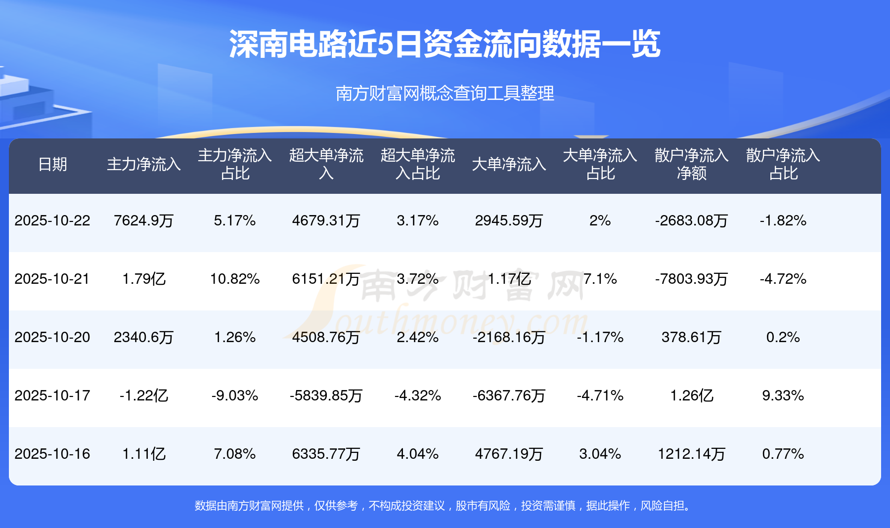 10月22日消息,深南电路主力资金净流入7624.9万元,超大单资金净流入4679.31万元,散户资金净流出2683.08万元。