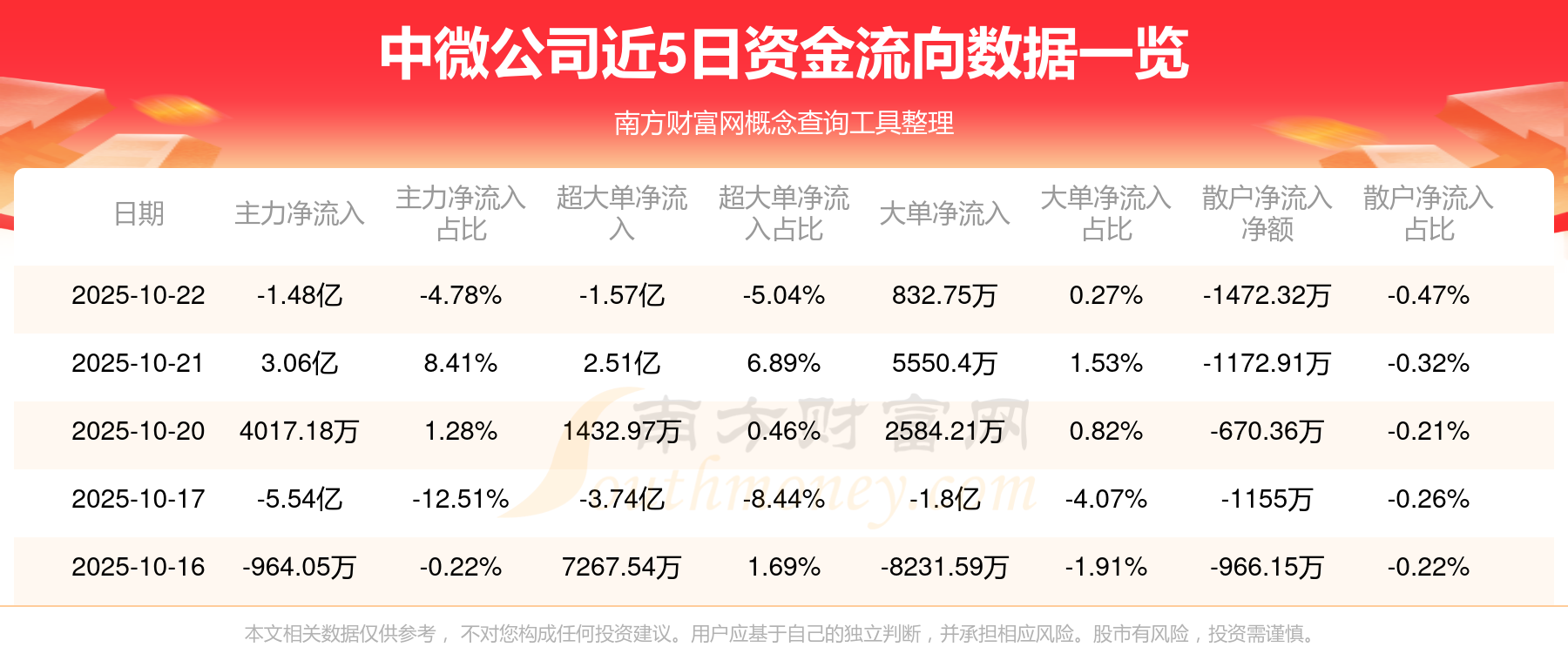 10月22日消息,中微公司主力净流出1.48亿元,超大单净流出1.57亿元,散户净流出1472.32万元。