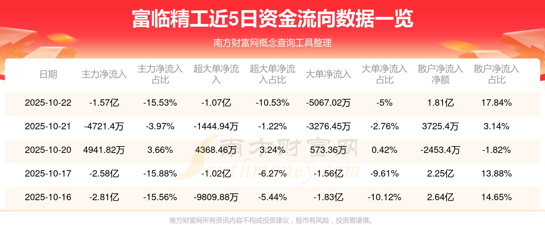 10月22日消息,富临精工10月22日主力资金净流出1.57亿元,超大单资金净流出1.07亿元,大单资金净流出5067.02万元,散户资金净流入1.81亿元。