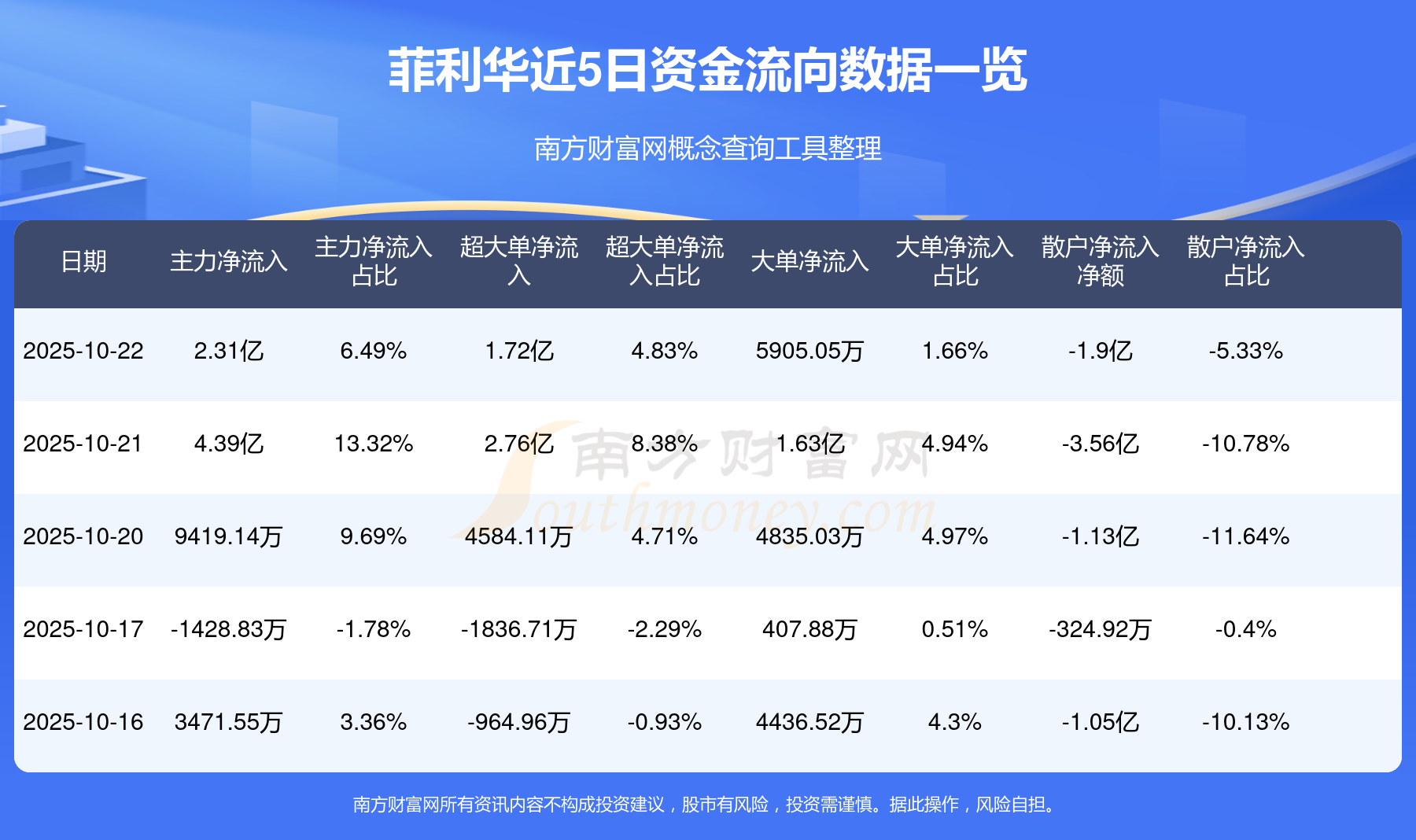 资金流向数据方面,10月22日主力资金净流流入2.31亿元,超大单资金净流入1.72亿元,大单资金净流入5905.05万元,散户资金净流出1.9亿元。