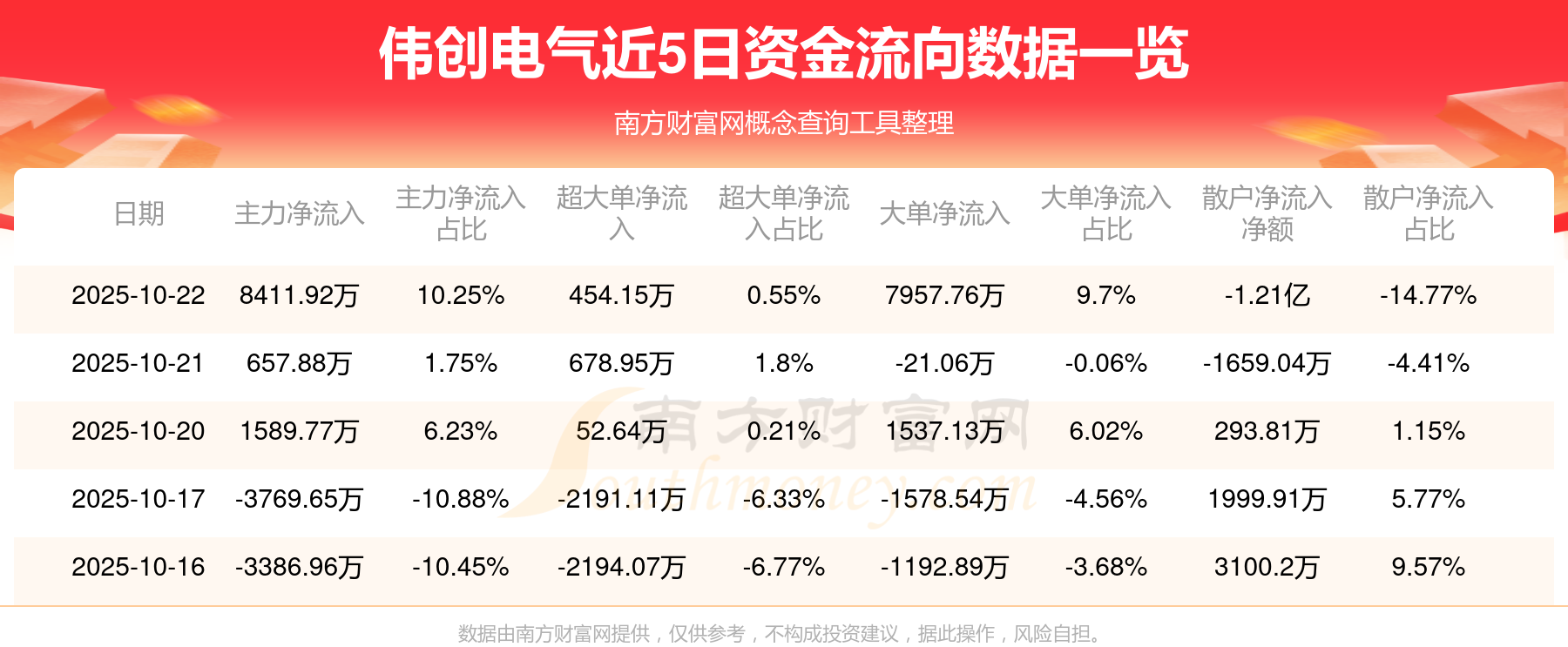 10月22日消息,伟创电气主力净流入8411.92万元,超大单净流入454.15万元,散户净流出1.21亿元。