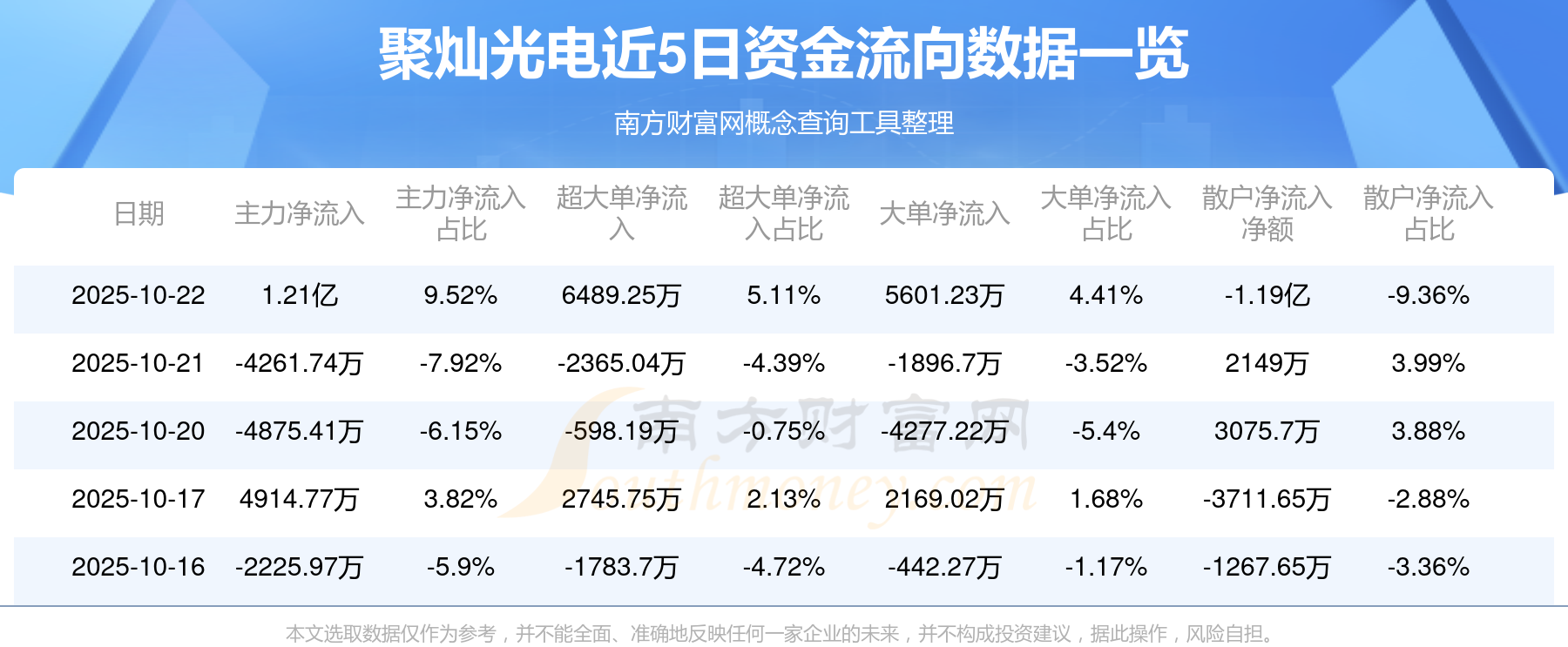 10月22日消息,聚灿光电主力净流入1.21亿元,超大单净流入6489.25万元,散户净流出1.19亿元。