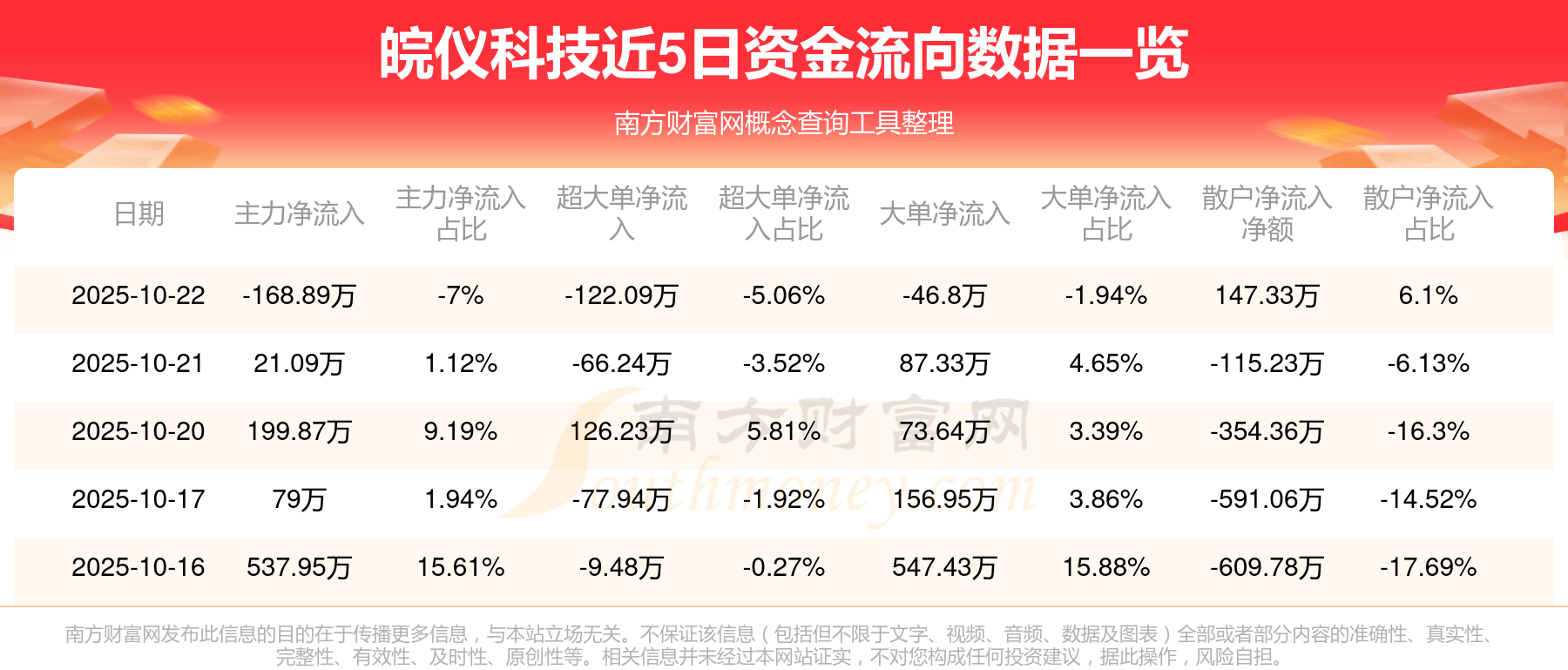 10月22日消息,皖仪科技主力资金净流出168.89万元,超大单资金净流出122.09万元,散户资金净流入147.33万元。