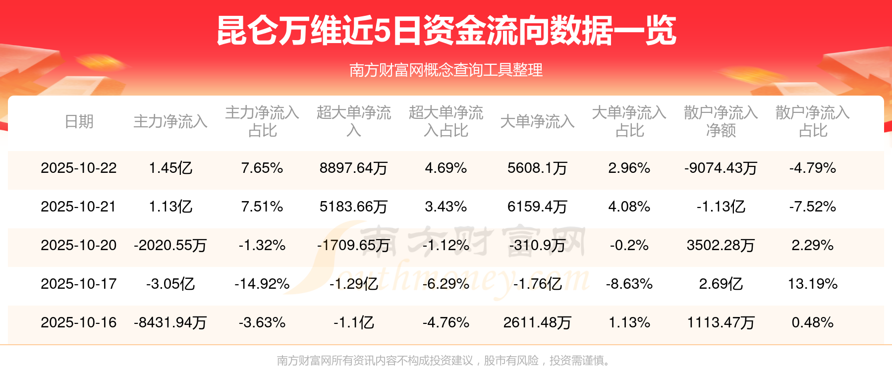 10月22日消息,昆仑万维资金净流入1.45亿元,超大单资金净流入8897.64万元,换手率3.44%,成交金额17.46亿元。