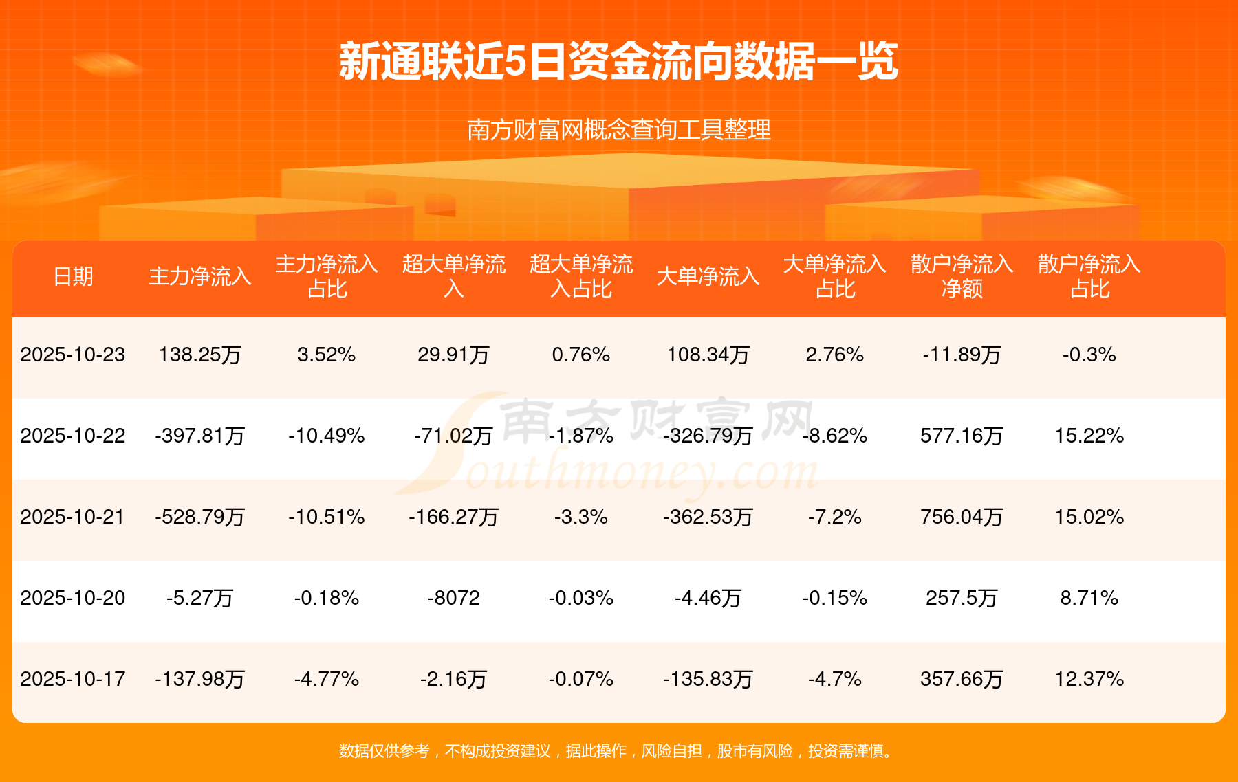 10月23日消息,新通联主力净流入138.25万元,超大单净流入29.91万元,散户净流出11.89万元。