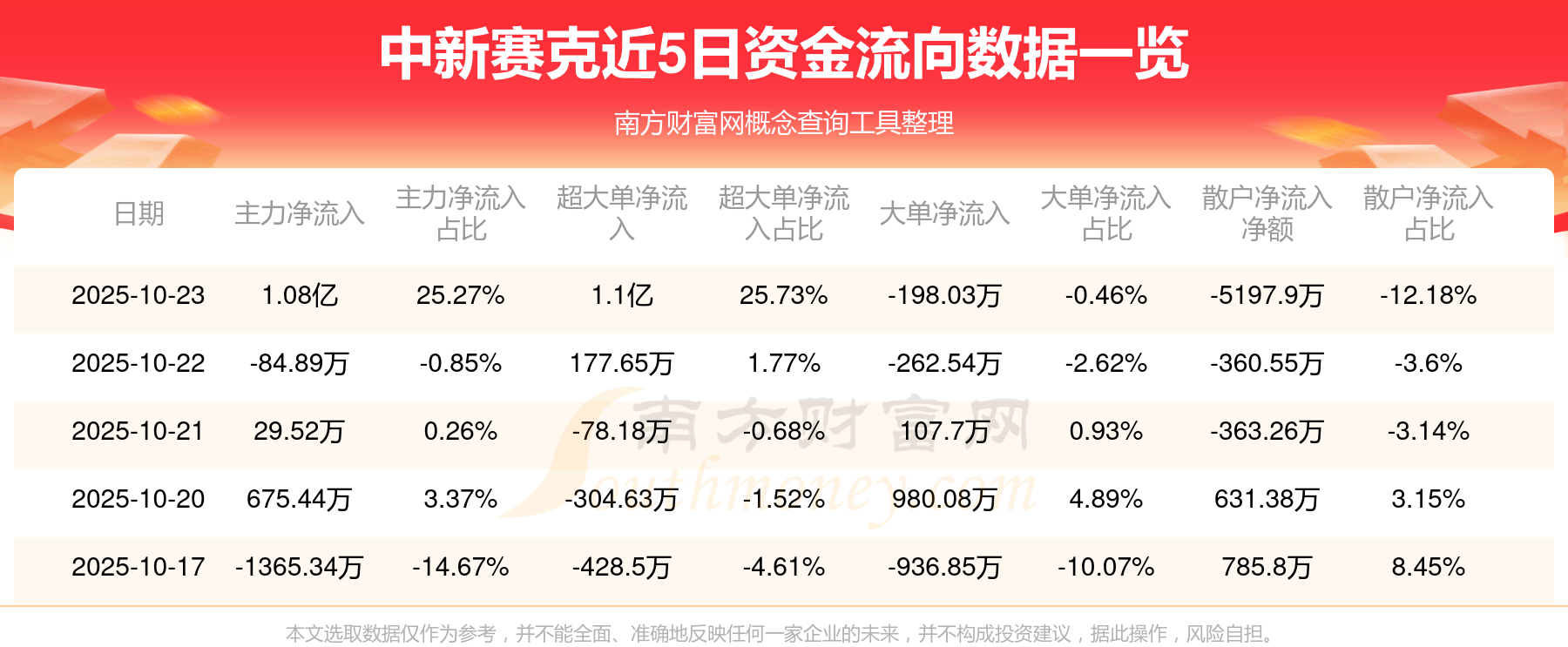 资金流向数据方面,10月23日主力资金净流流入1.08亿元,超大单资金净流入1.1亿元,大单资金净流出198.03万元,散户资金净流出5197.9万元。