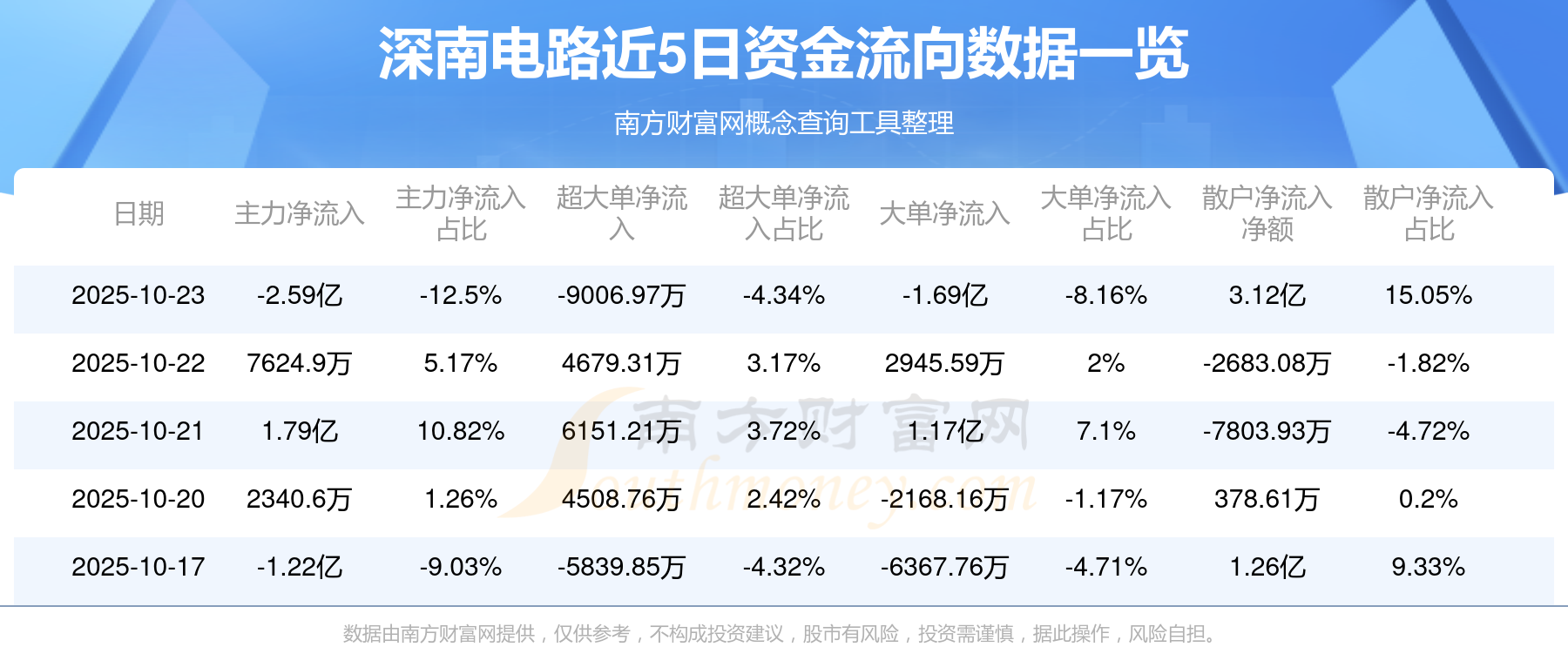 10月23日消息,深南电路资金净流出2.59亿元,超大单净流出9006.97万元,换手率1.61%,成交金额20.74亿元。