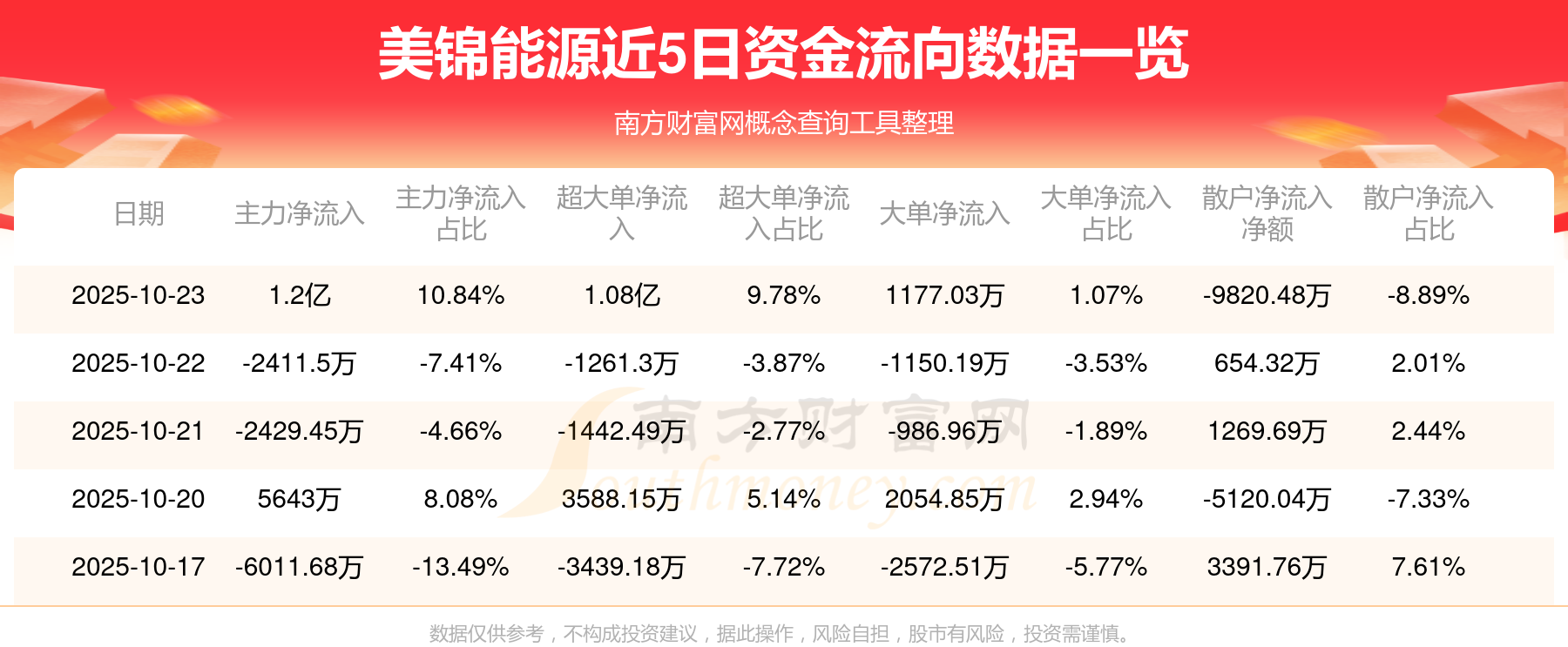 10月23日消息,美锦能源10月23日主力净流入1.2亿元,超大单净流入1.08亿元,大单净流入1177.03万元,散户净流出9820.48万元。