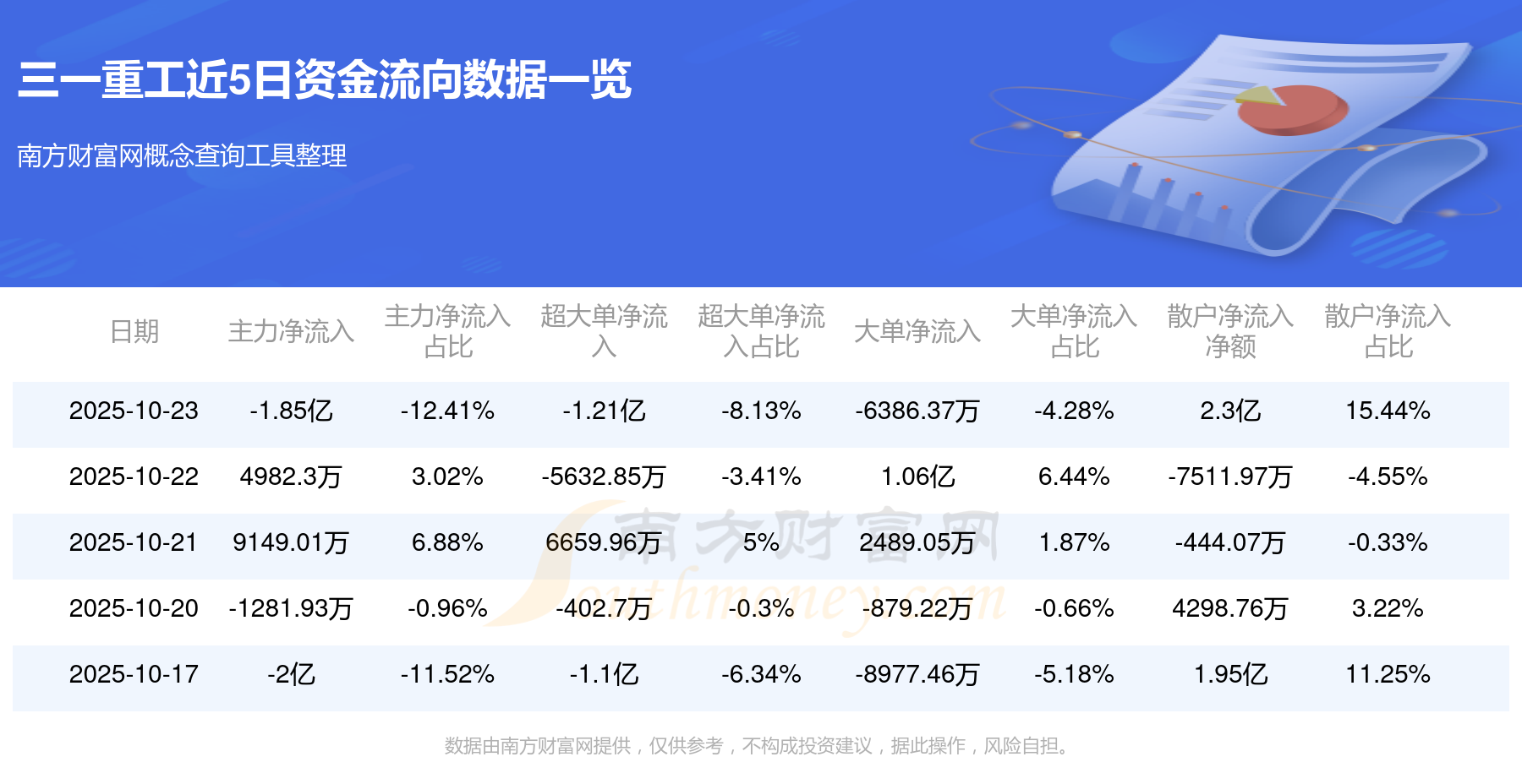 10月23日消息,三一重工资金净流出1.85亿元,超大单资金净流出1.21亿元,换手率0.78%,成交金额14.91亿元。