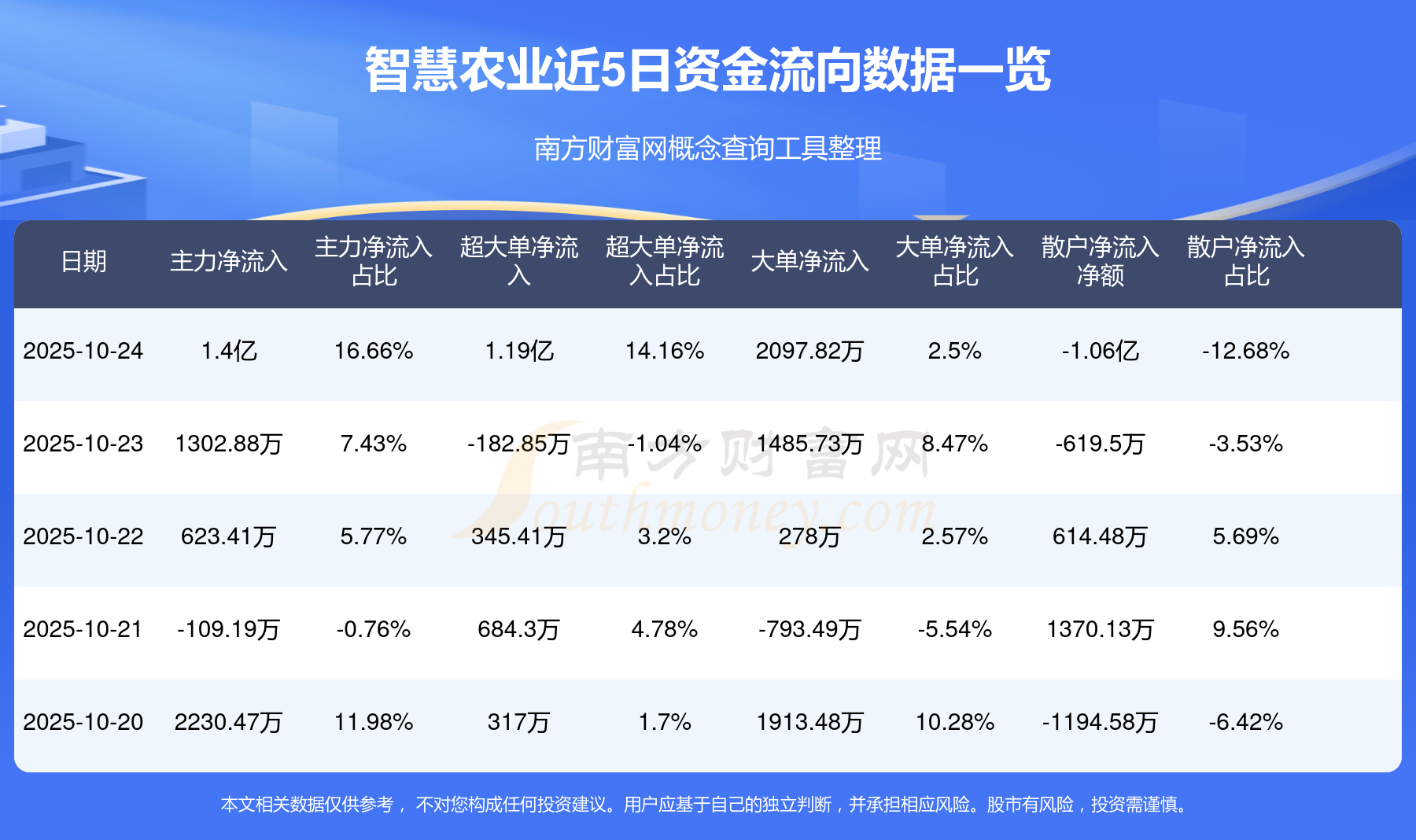 10月20日收盘,智慧农业涨1.56%,报3.530元;5日内股价上涨7.08%,成交额8.39亿元,市值为51.08亿元。