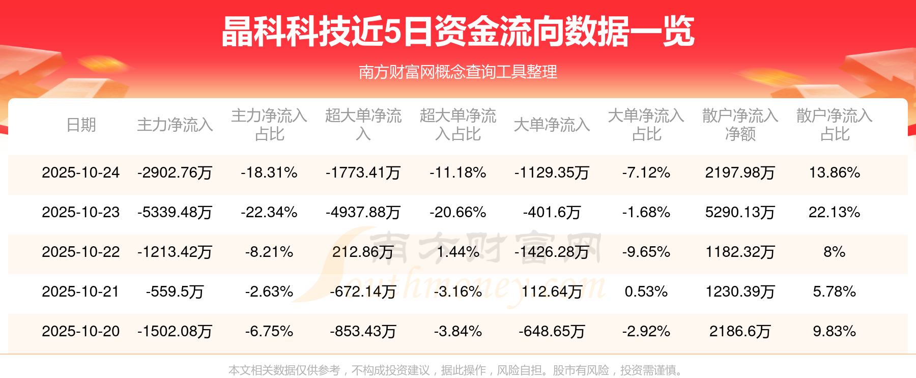 10月24日消息,晶科科技主力净流出2902.76万元,超大单净流出1773.41万元,散户净流入2197.98万元。