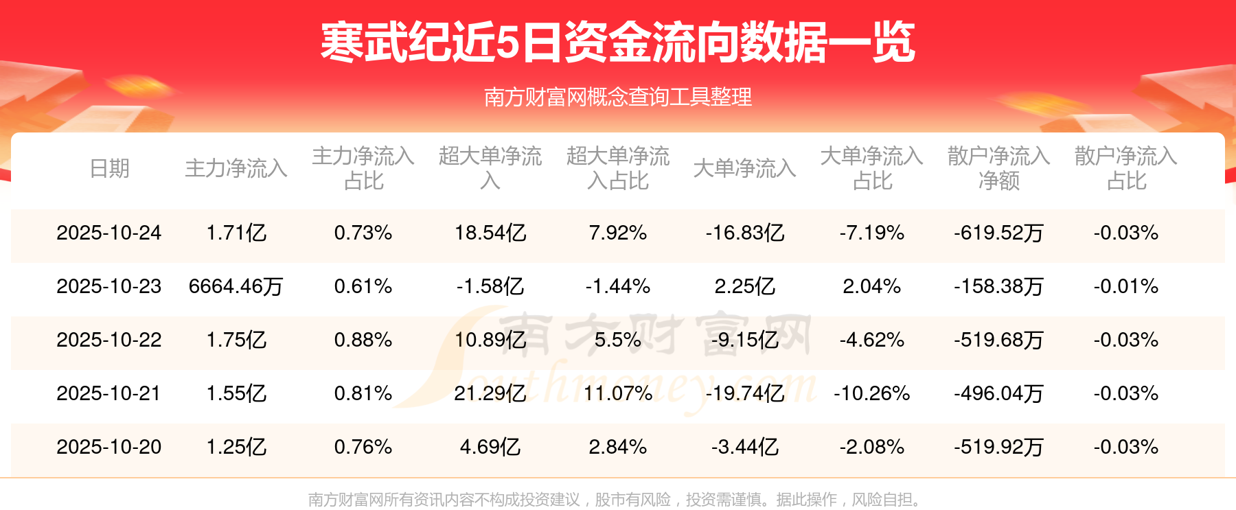 10月24日消息,寒武纪-U10月24日主力净流入1.71亿元,超大单净流入18.54亿元,大单净流出16.83亿元,散户净流出619.52万元。
