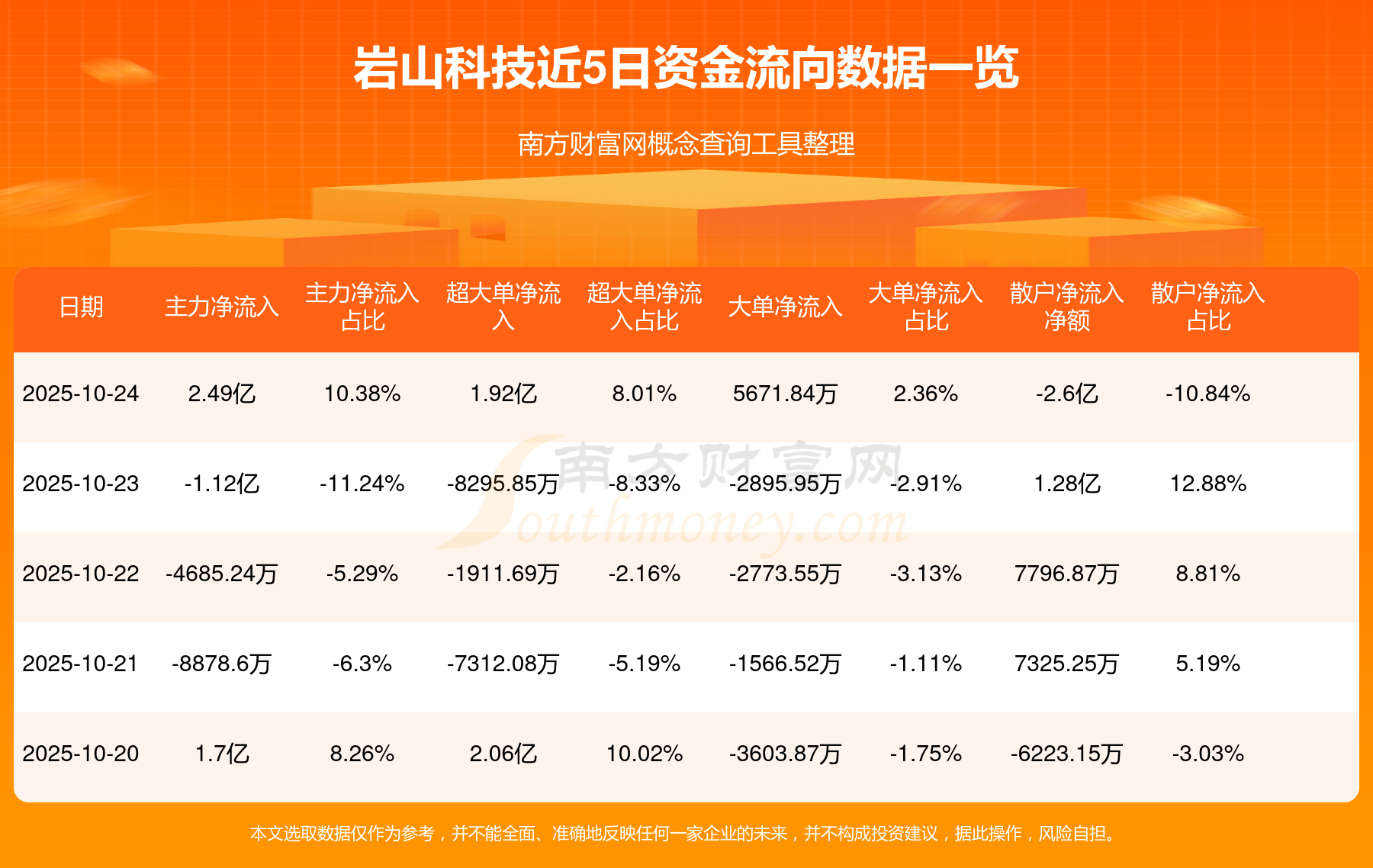 资金流向数据方面,10月24日主力资金净流流入2.49亿元,超大单资金净流入1.92亿元,大单资金净流入5671.84万元,散户资金净流出2.6亿元。