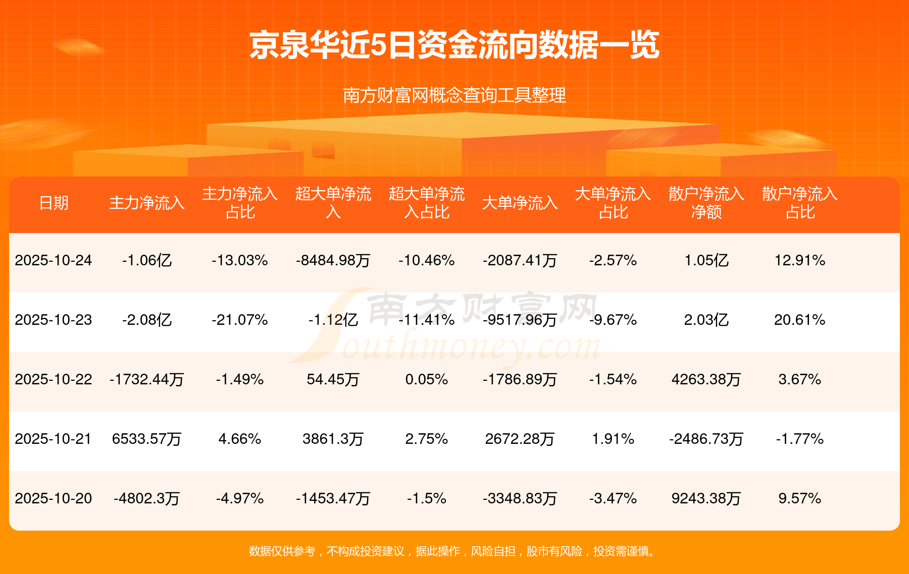 10月24日消息,京泉华资金净流出1.06亿元,超大单净流出8484.98万元,换手率15.09%,成交金额8.11亿元。
