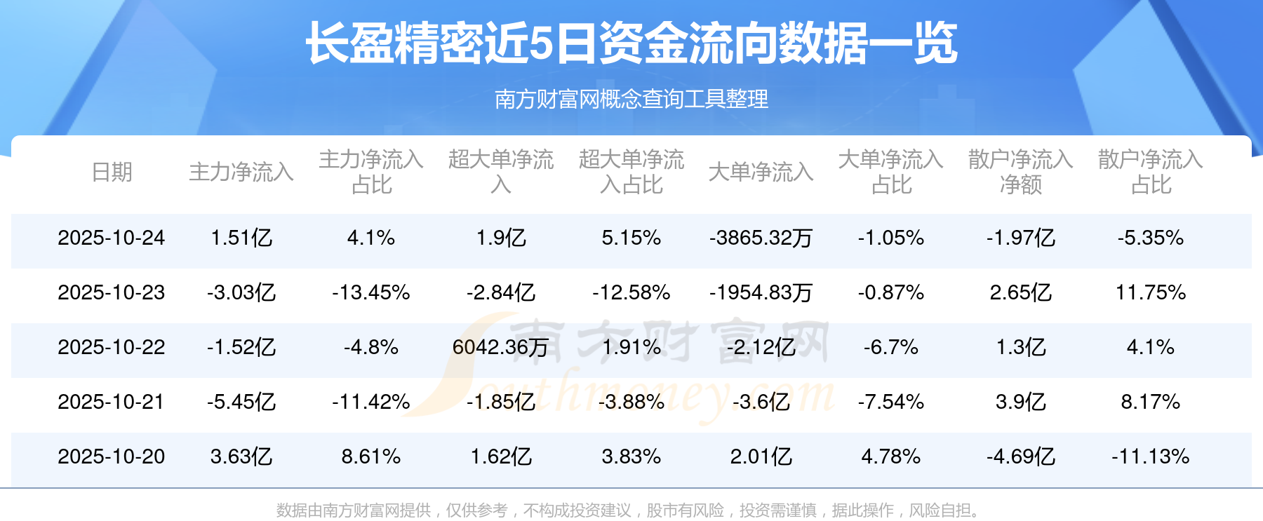 10月24日消息,长盈精密主力净流入1.51亿元,超大单净流入1.9亿元,散户净流出1.97亿元。