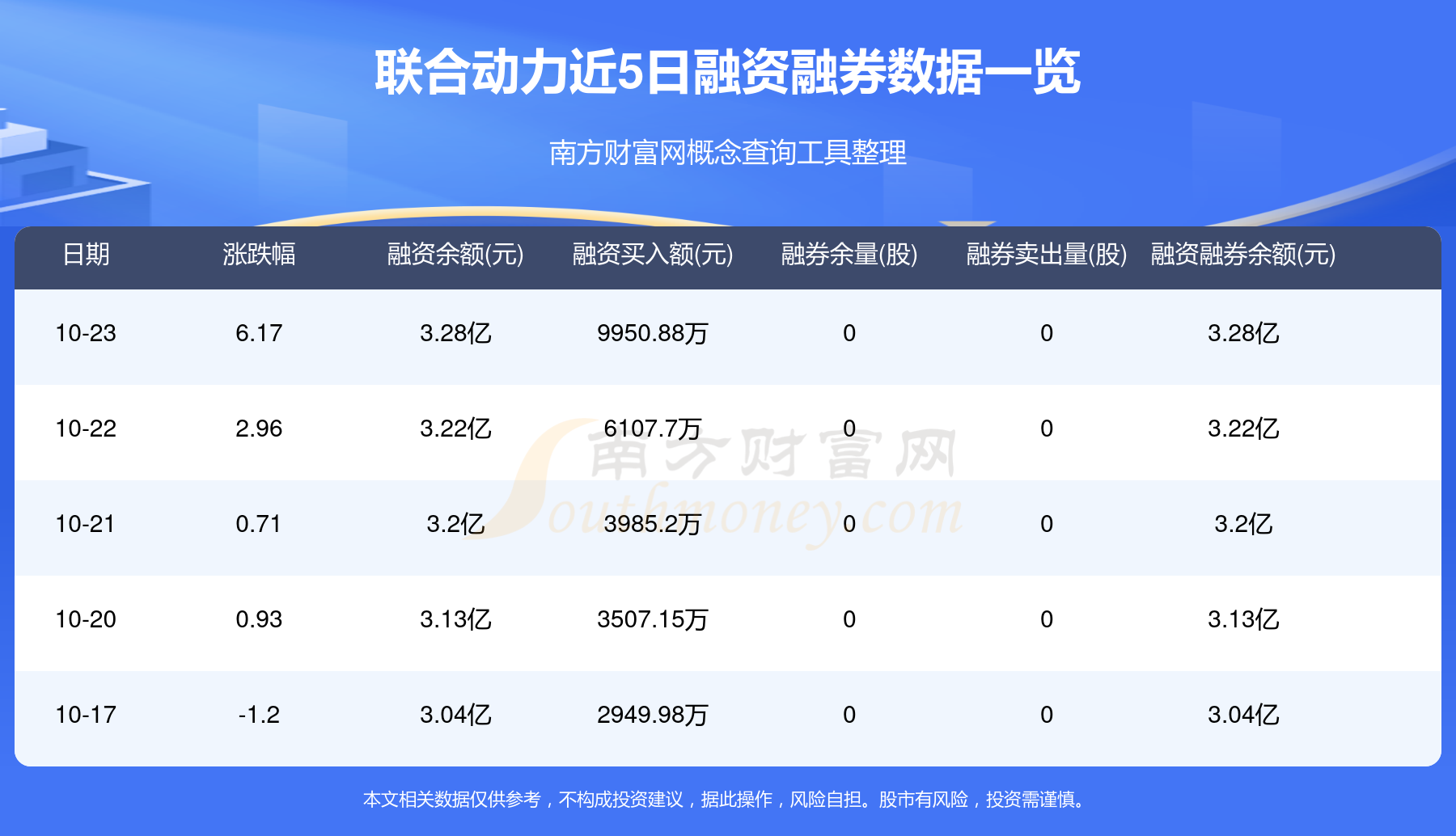 联合动力10月23日融券信息显示,融资方面,当日融资买入9950.88万元,融资偿还9355.56万元,融资净买额595.32万元。近5日融资融券数据一览见下表: