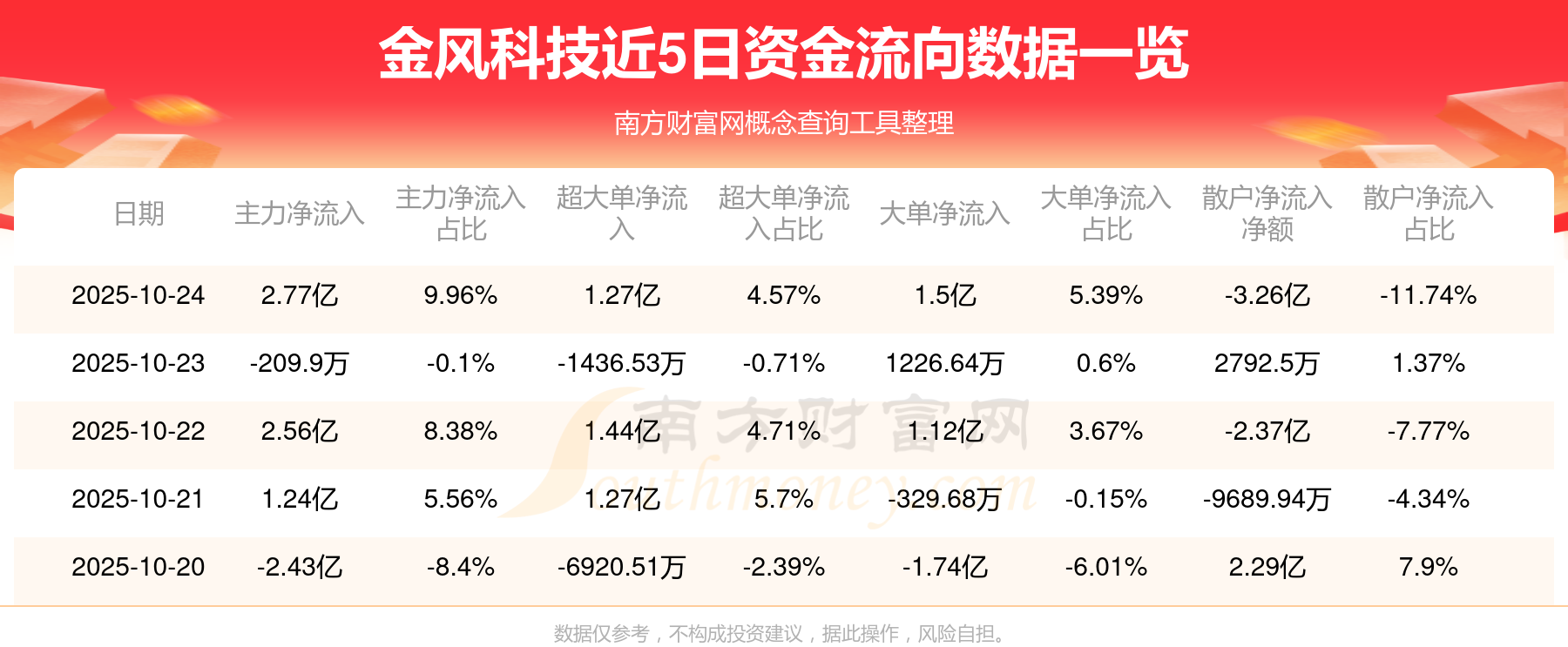 10月24日消息,金风科技主力净流入2.77亿元,超大单净流入1.27亿元,散户净流出3.26亿元。