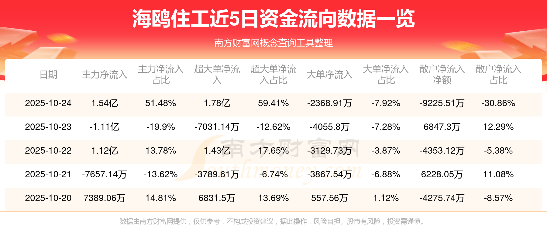 10月24日消息,海鸥住工10月24日主力资金净流入1.54亿元,超大单资金净流入1.78亿元,大单资金净流出2368.91万元,散户资金净流出9225.51万元。