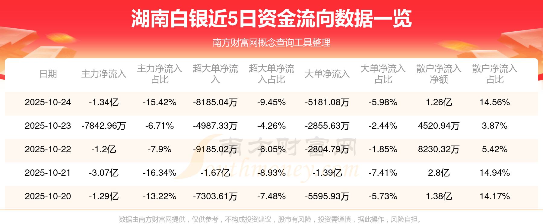 10月24日消息,湖南白银主力资金净流出1.34亿元,超大单资金净流出8185.04万元,散户资金净流入1.26亿元。