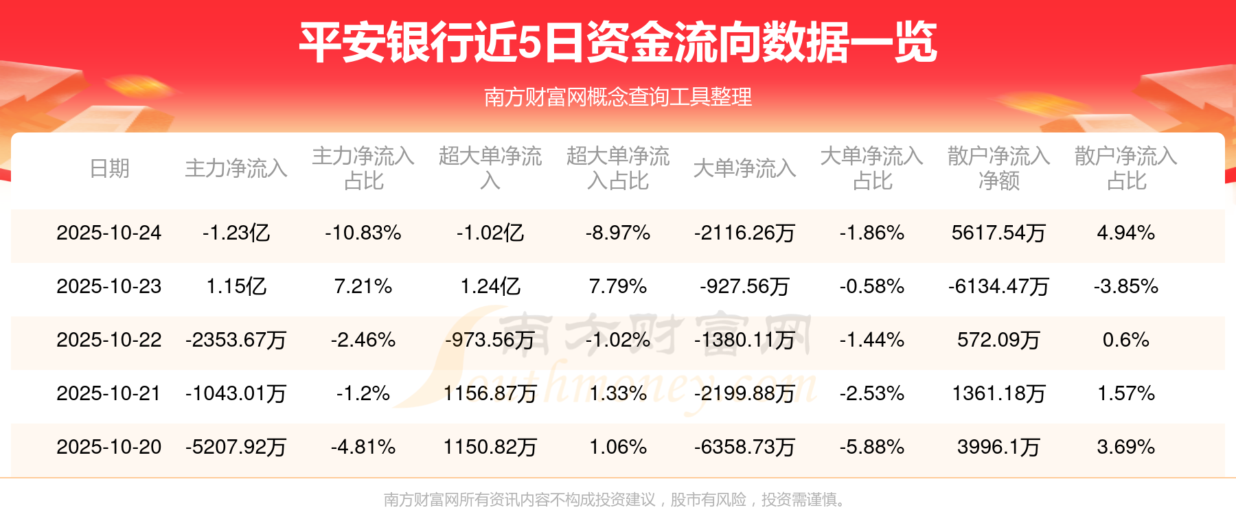 10月24日消息,平安银行资金净流出1.23亿元,超大单资金净流出1.02亿元,换手率0.51%,成交金额11.38亿元。