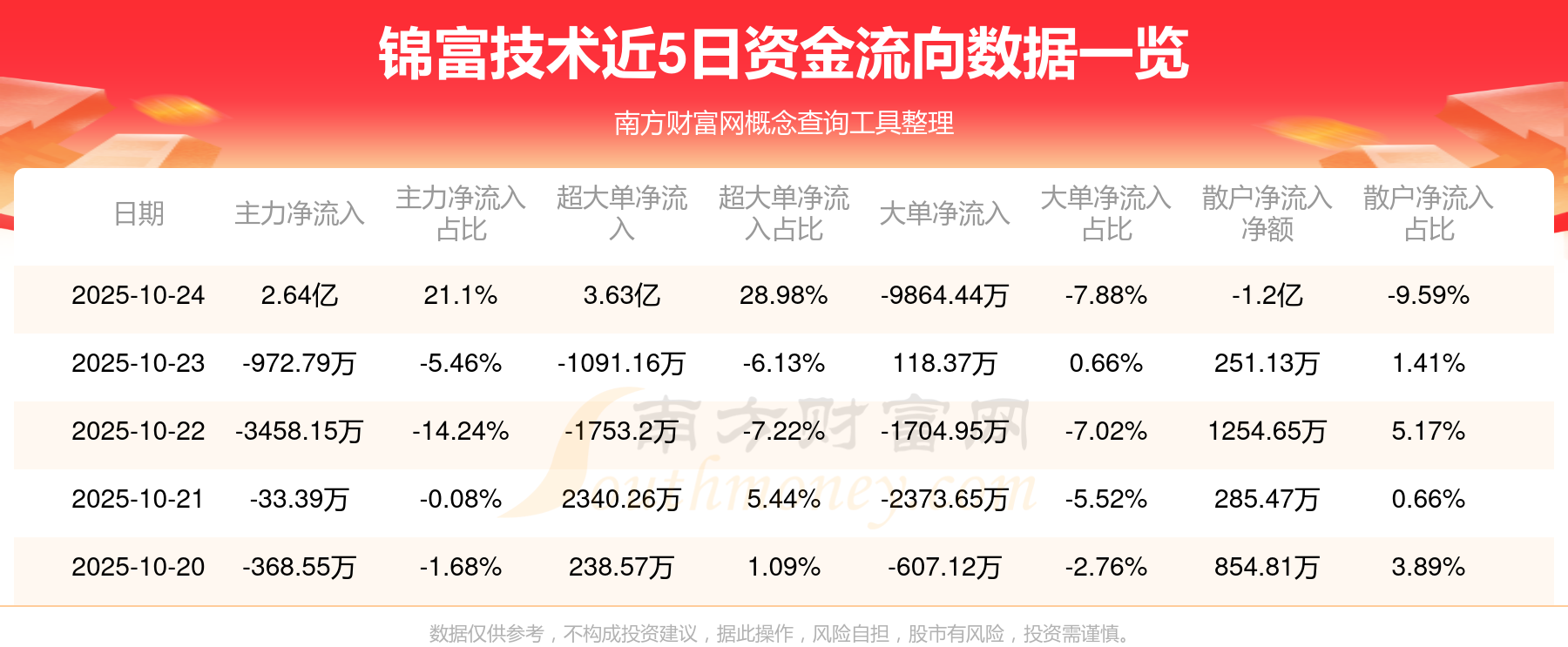 10月24日收盘消息,锦富技术开盘报价6.11元,收盘于7.360元,成交额12.51亿元。