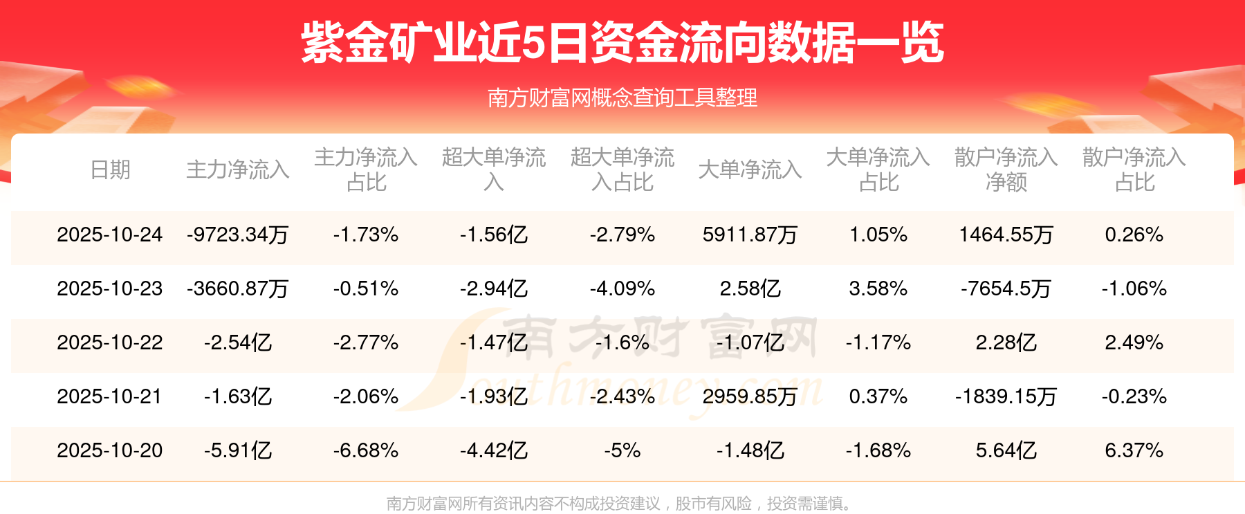 10月24日消息,紫金矿业主力资金净流出9723.34万元,超大单资金净流出1.56亿元,散户资金净流入1464.55万元。