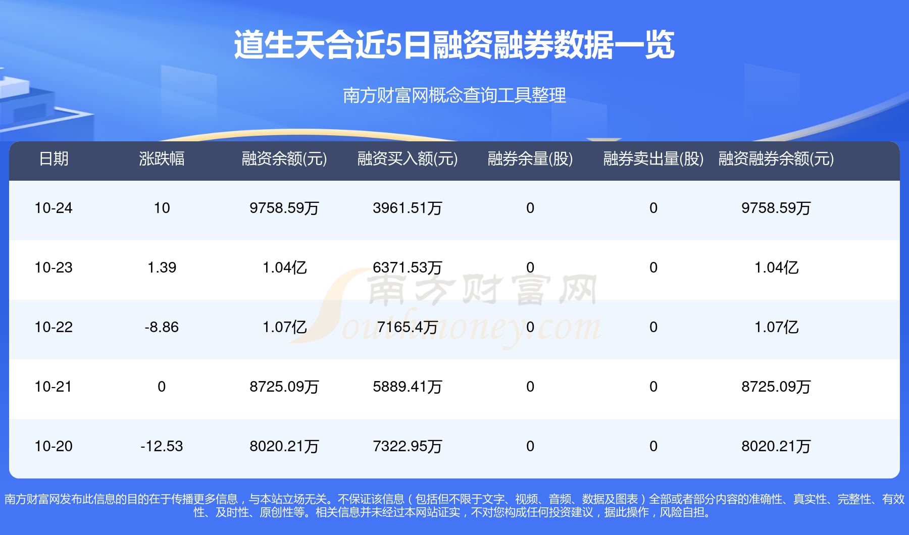 10月24日道生天合融券信息显示,融资方面,当日融资买入3961.51万元,融资偿还4606.18万元,融资净买额-644.68万元。近5日融资融券数据一览见下表: