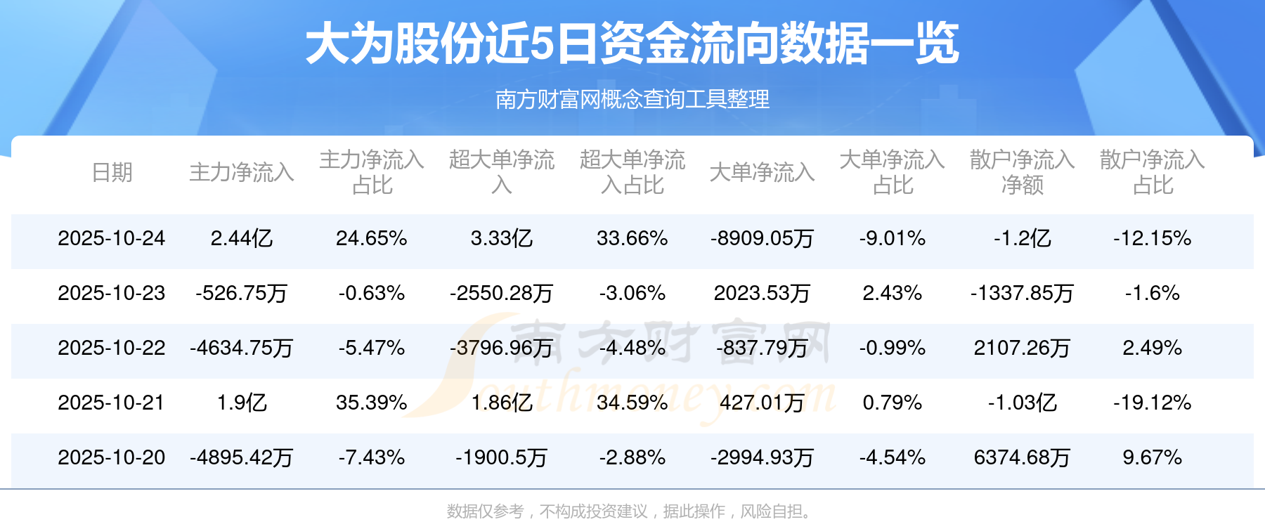10月24日消息,大为股份资金净流入2.44亿元,超大单资金净流入3.33亿元,换手率21.24%,成交金额9.89亿元。