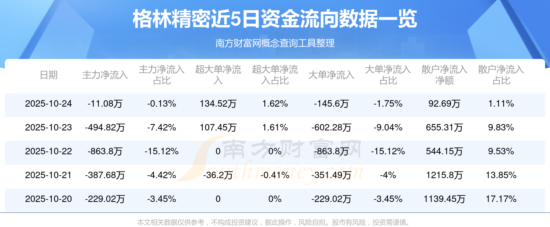 10月24日消息,格林精密主力资金净流出11.08万元,超大单资金净流入134.52万元,散户资金净流入92.69万元。