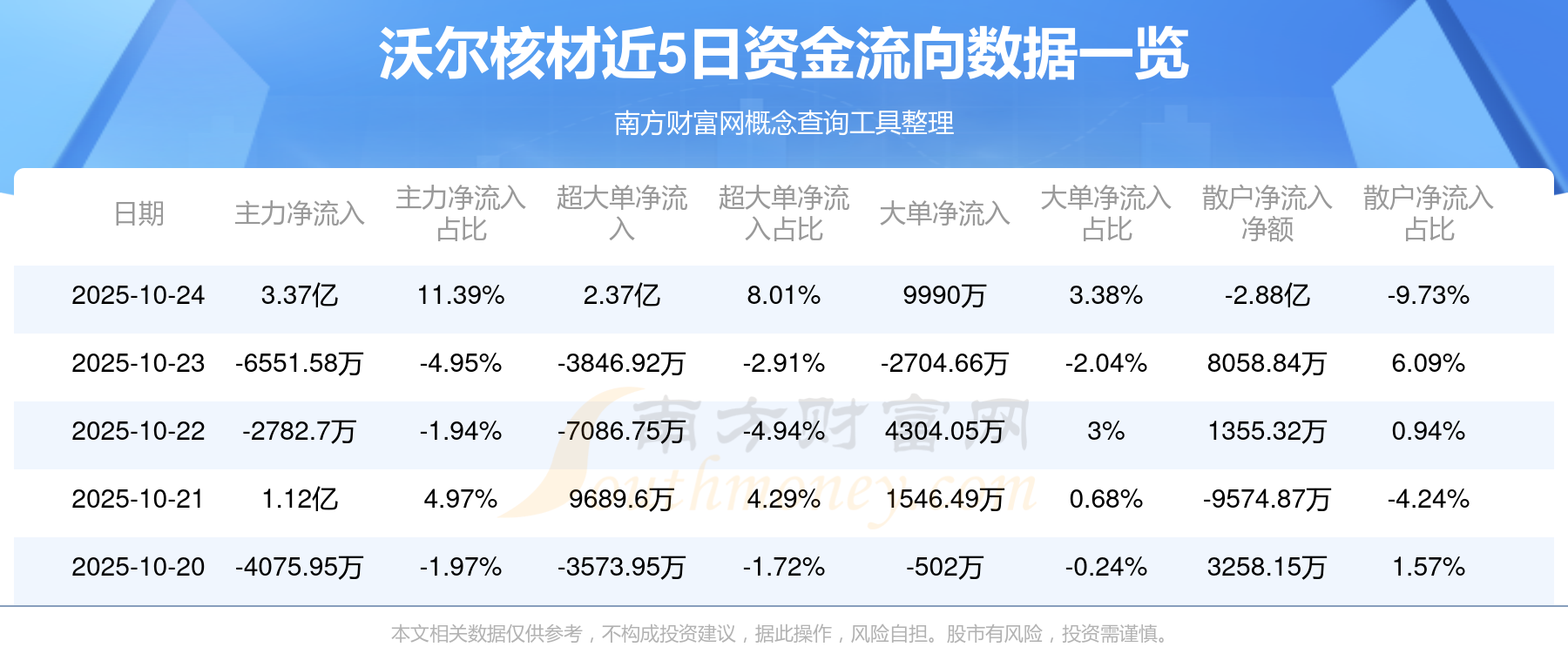 资金流向数据方面,10月24日主力资金净流流入3.37亿元,超大单资金净流入2.37亿元,大单资金净流入9990万元,散户资金净流出2.88亿元。