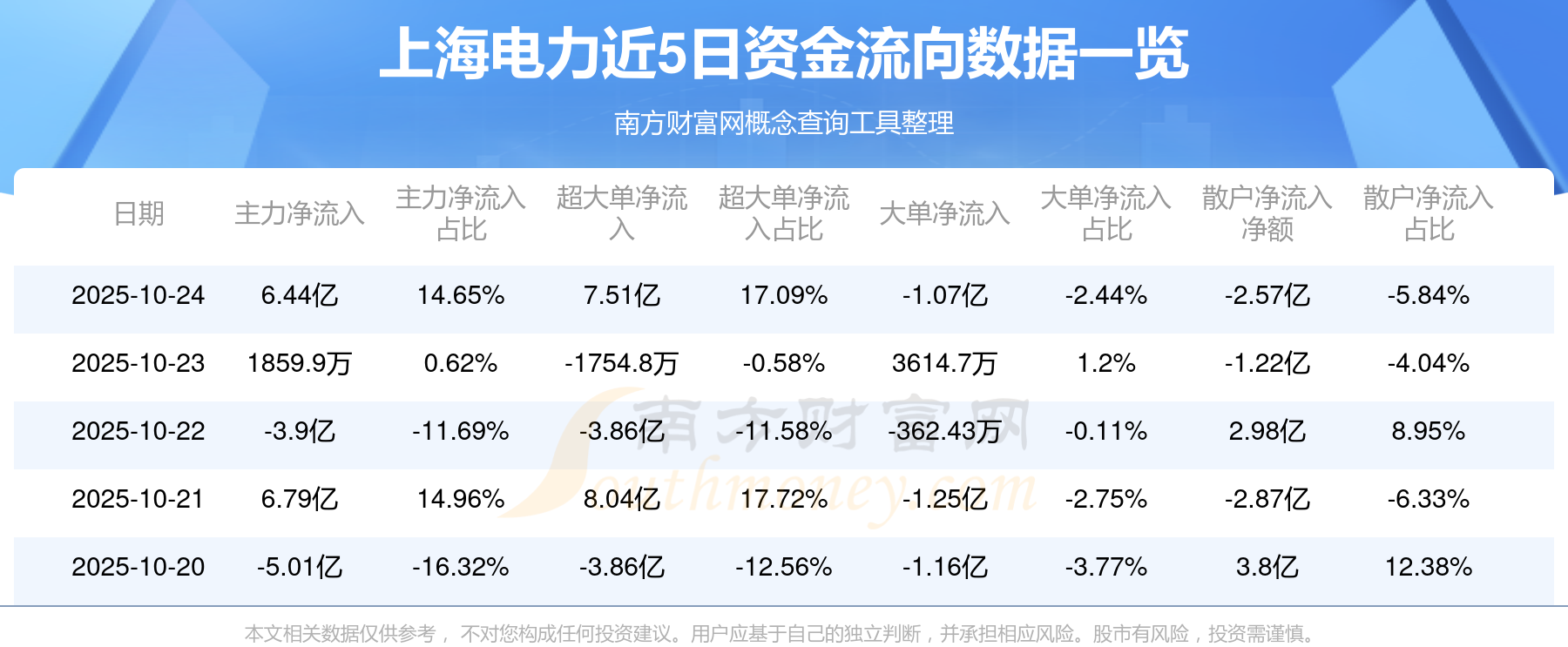 10月24日消息,上海电力10月24日主力净流入6.44亿元,超大单净流入7.51亿元,大单净流出1.07亿元,散户净流出2.57亿元。
