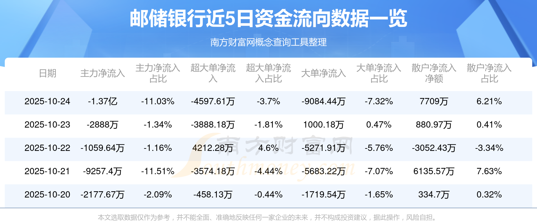 10月24日消息,邮储银行主力资金净流出1.37亿元,超大单资金净流出4597.61万元,散户资金净流入7709万元。