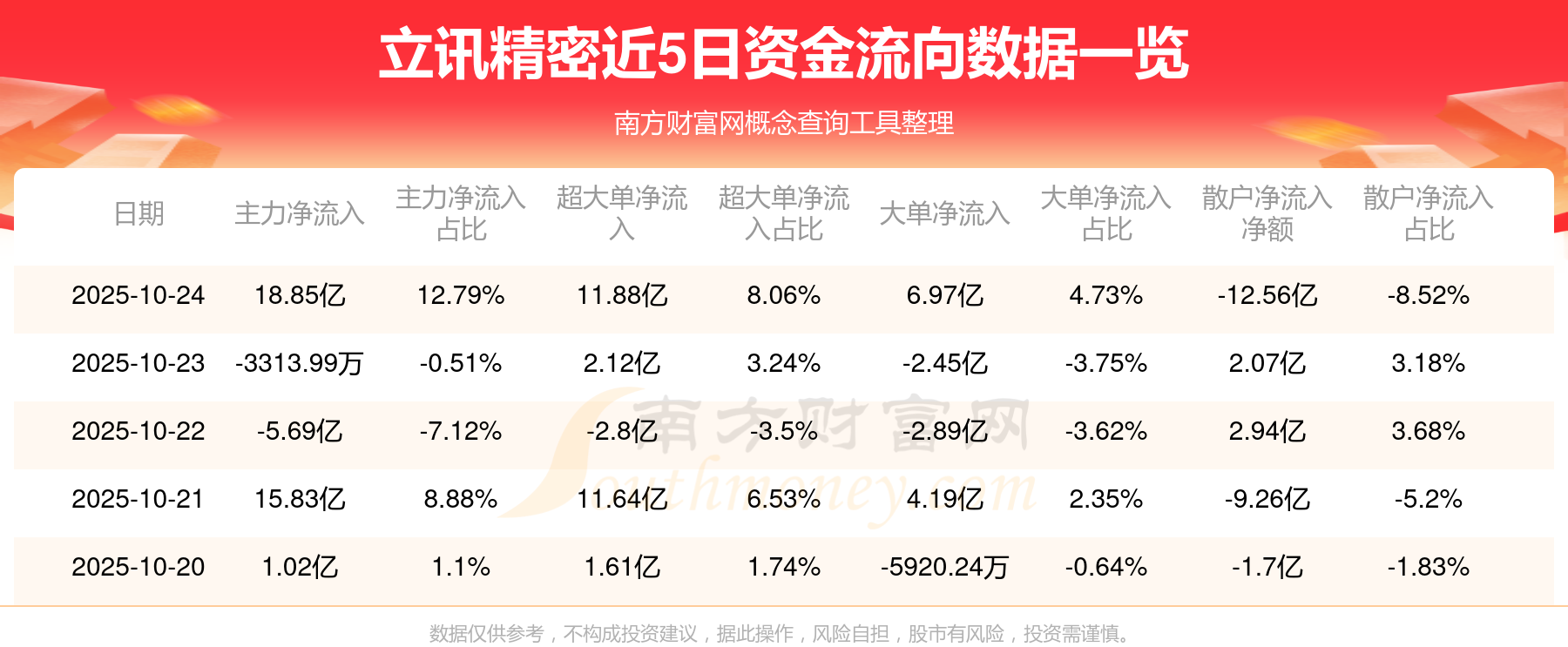 10月24日该股主力资金净流入18.85亿元,超大单资金净流入11.88亿元,大单资金净流入6.97亿元,中单资金净流出6.29亿元,散户资金净流出12.56亿元。