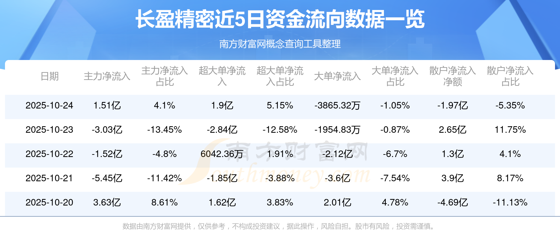 10月24日消息,长盈精密主力资金净流入1.51亿元,超大单资金净流入1.9亿元,散户资金净流出1.97亿元。